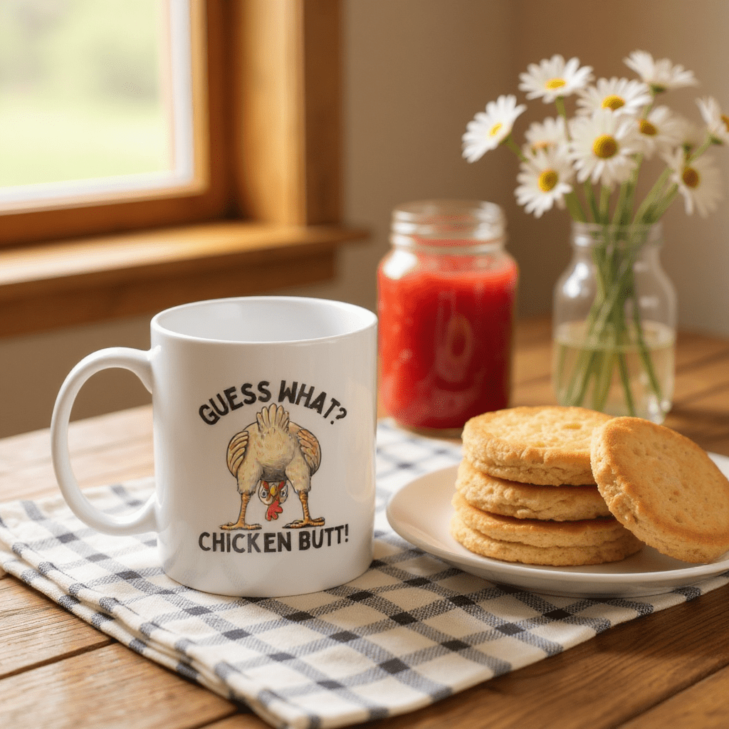 Brighten your mornings with the Guess What? Chicken Butt! Mug, designed to bring a hearty chuckle with every sip. Showcasing a cheeky chicken looking between its legs, this playful mug combines humor and whimsy, making it the perfect conversation starter at your breakfast table. Whether you're gearing up for a busy day or enjoying a relaxing moment, this mug adds a lighthearted touch to your coffee or tea routine. It’s an ideal gift for anyone who appreciates a good pun and loves to start the day with a smile. Make every cup memorable with this fun and unique mug!
