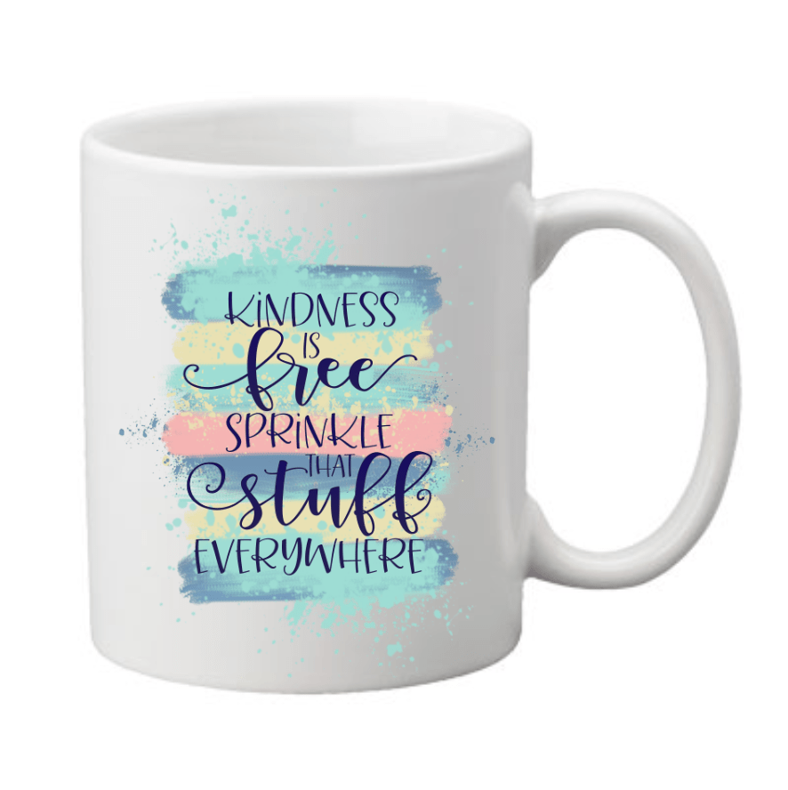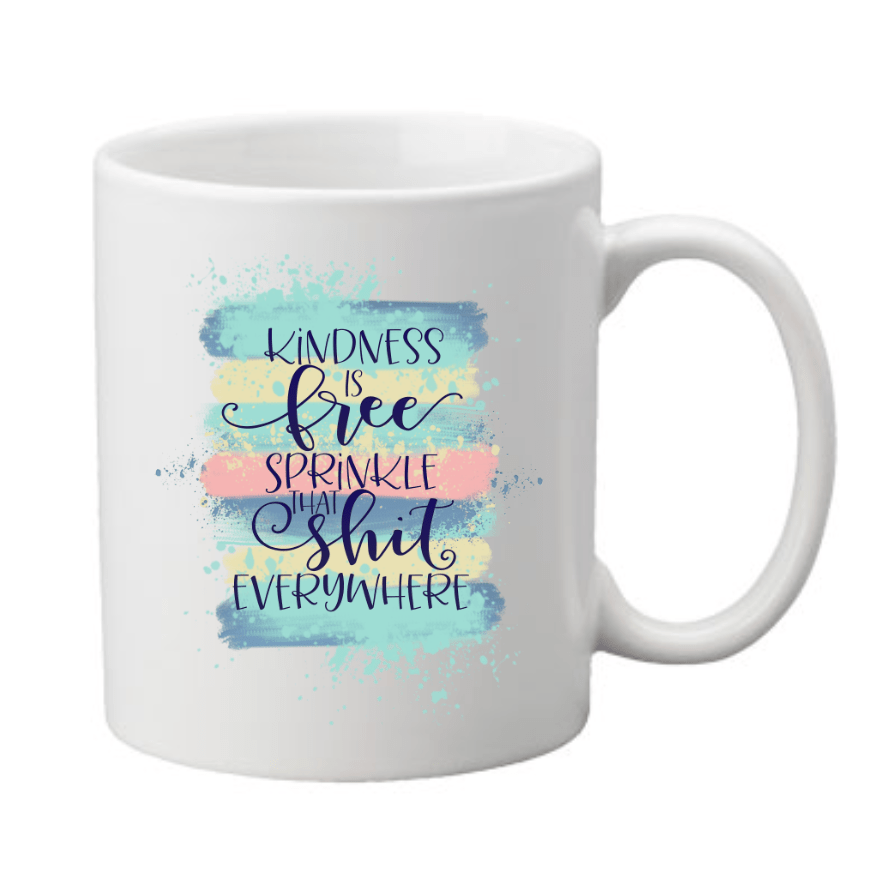 Kindness Is Free, Sprinkle That Shit/Stuff Everywhere printed on a 15oz coffee mug. These premium coffee mugs feature a glossy surface with a beautiful full color image printed onto it. It features sturdy walls for safe, durable use. They are dishwasher safe, microwave safe and lead free.