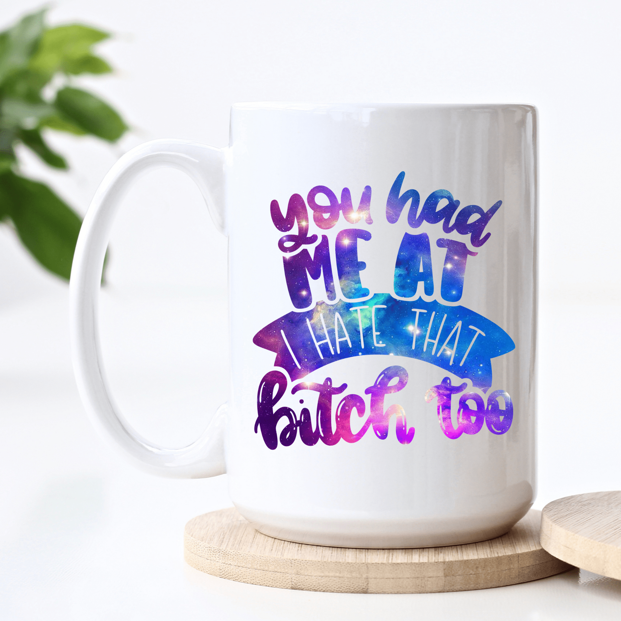 "You Had Me At I Hate That Bitch Too" printed in galaxy colors on a printed on a 15oz coffee cup. Perfect for friendship gifts! We are able to print this design in a different color or theme, please just contact us with your request.