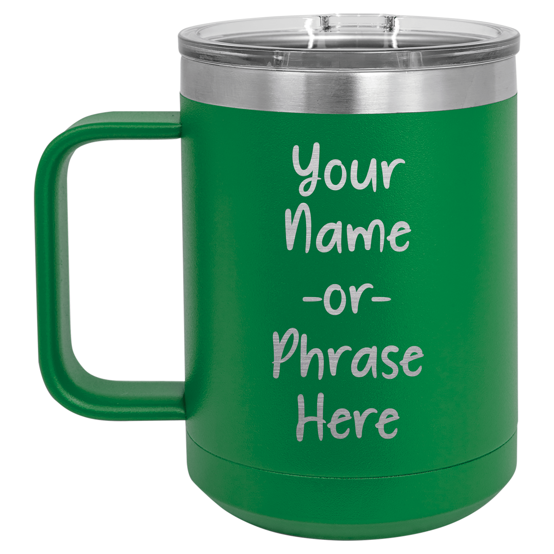 Choose your own phrase by typing whatever you wish us to engrave on your mug in the notes section.  Keep in mind, the more words, the smaller the text.