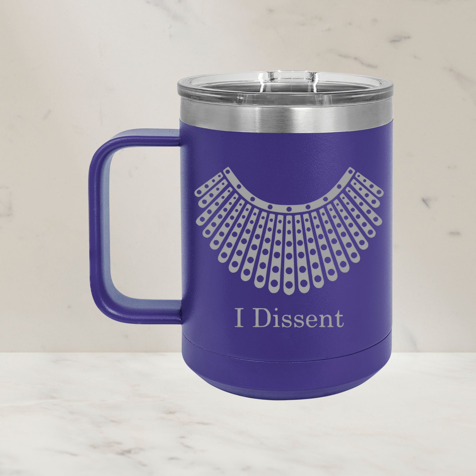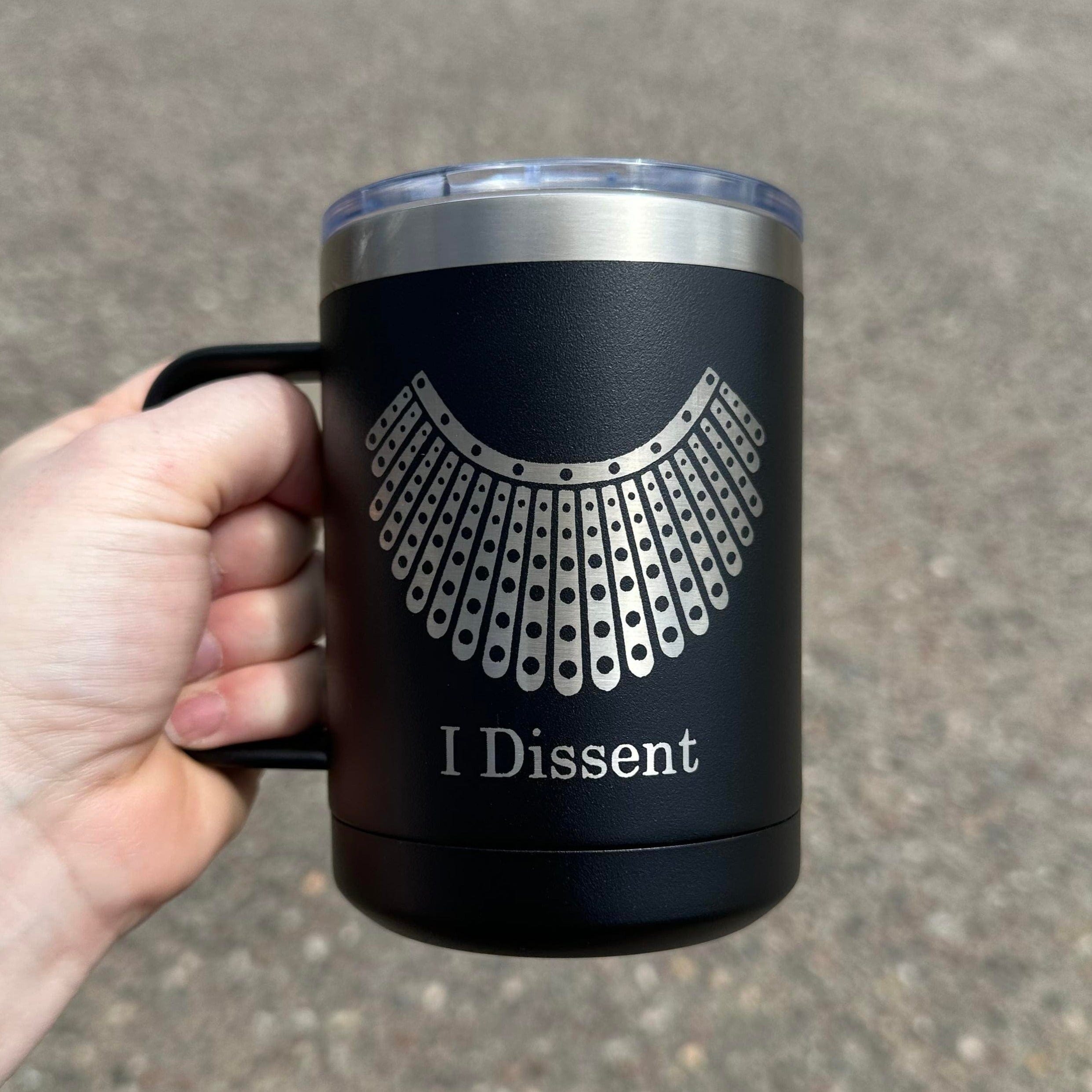Enjoy your favorite hot or cold beverage in style with this 15oz insulated mug. Engraved with the phrase "I Dissent" as spoken by the late Justice Ruth Bader Ginsberg, this mug is sure to start conversations and make a statement. The double-wall insulation ensures your beverage stays at the desired temperature for hours.