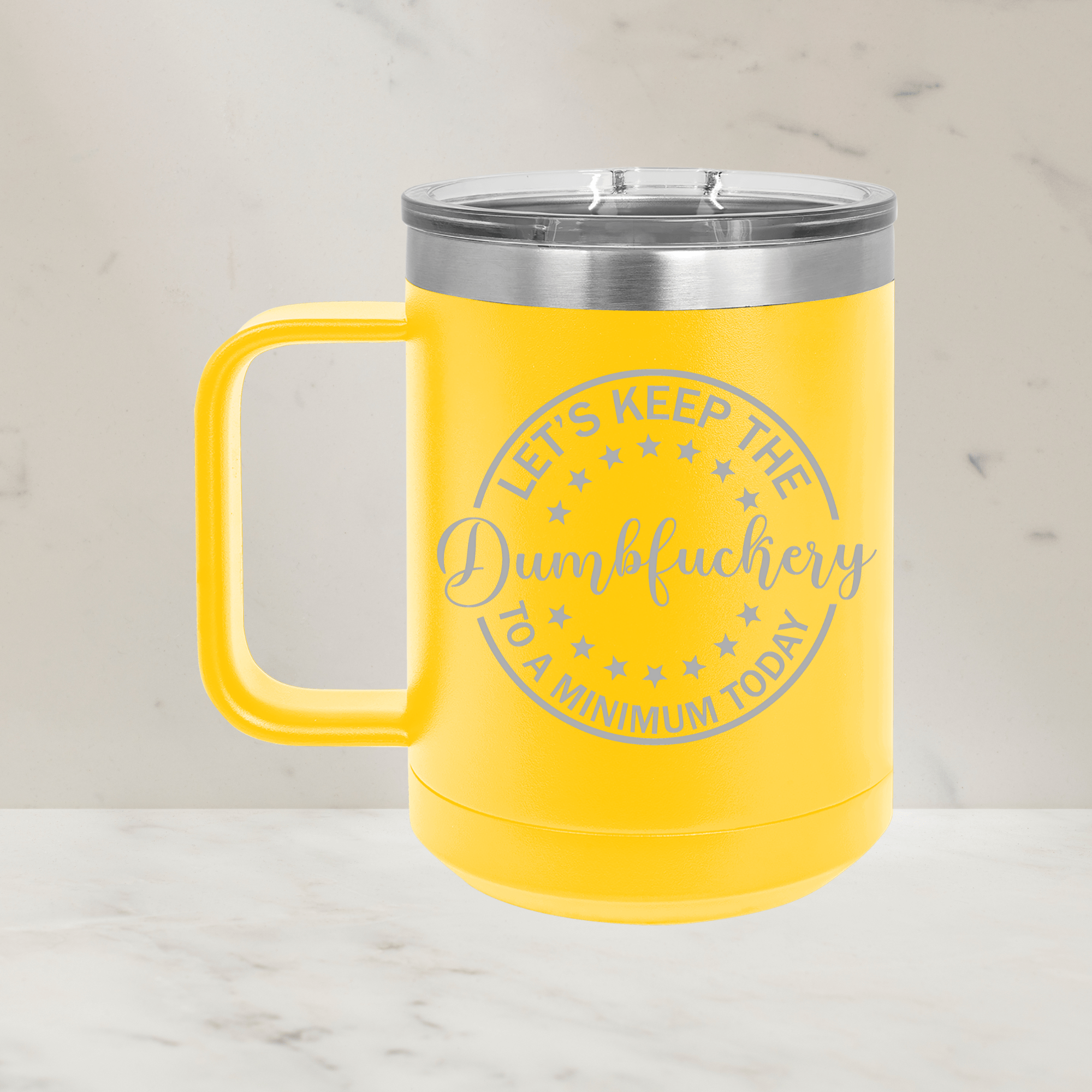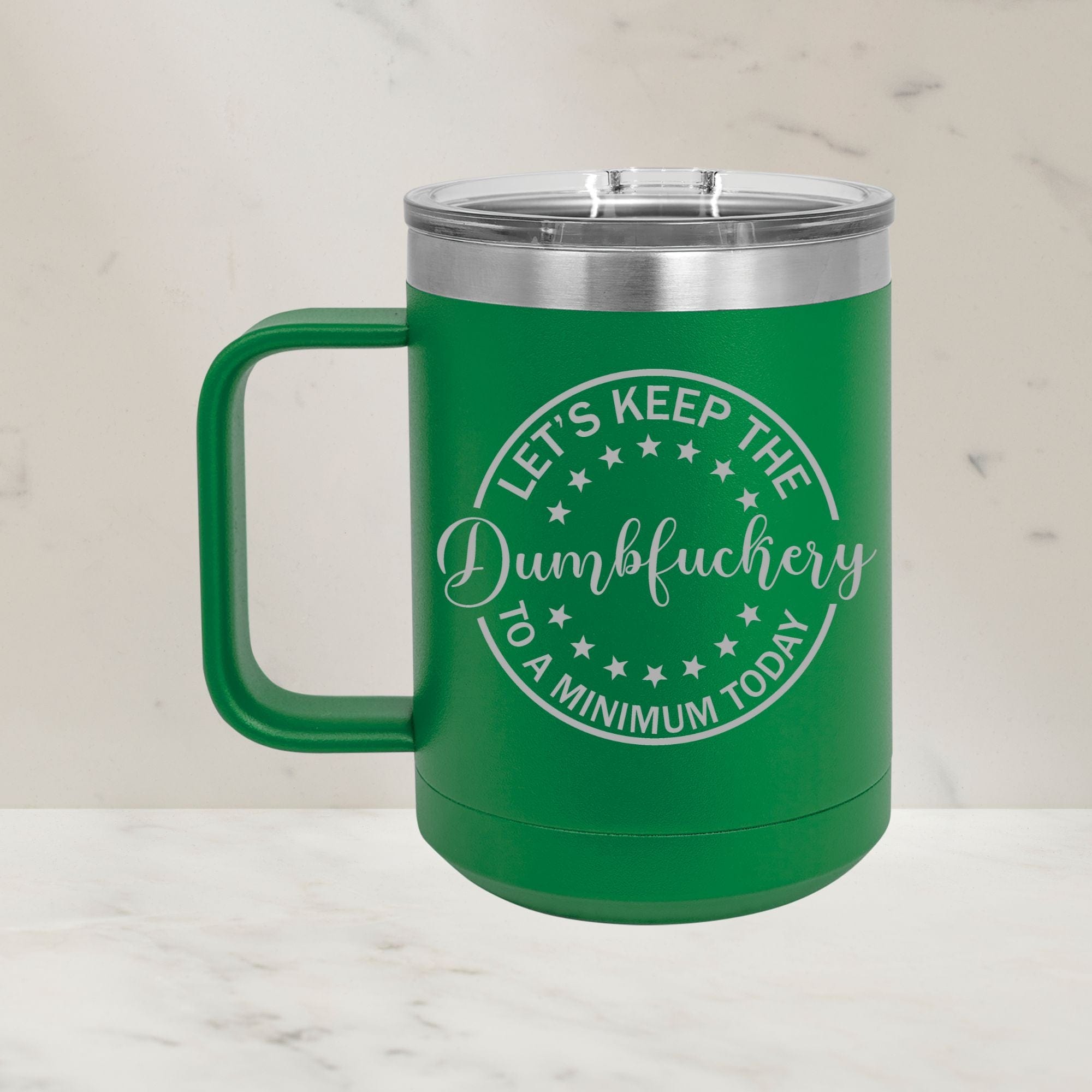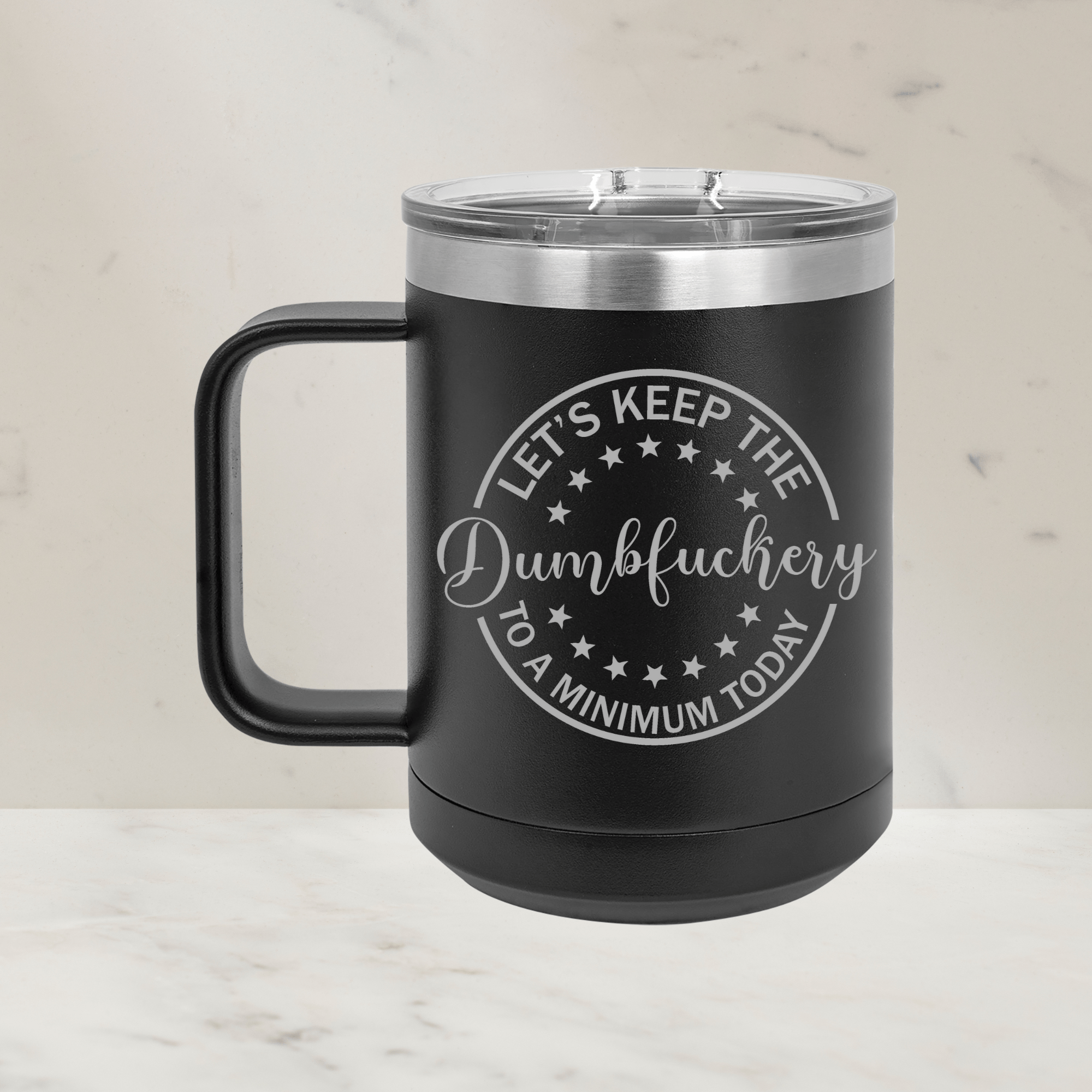 Enjoy your coffee in style with this humorous 15oz insulated mug. The engraved phrase "Let's keep the dumbfuckery to a minimum today" will be sure to put a smile on your face. Get ready to tackle the day without any unnecessary nonsense.