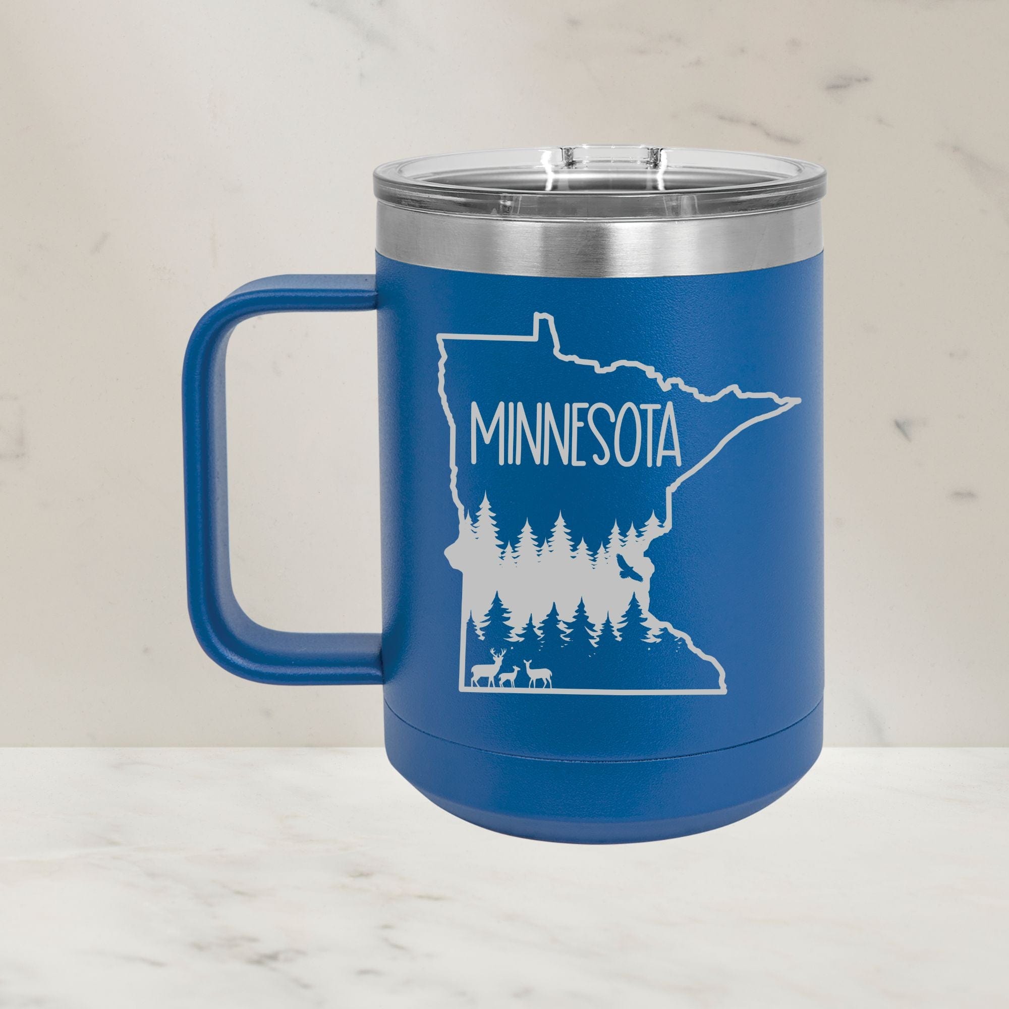 This 15oz insulated mug features a beautiful Minnesota landscape engraving, perfect for sipping your favorite hot or cold beverage. Its stainless steel construction and vacuum insulation ensure drinks stay at the ideal temperature longer. An ideal everyday mug for Minnesotans.