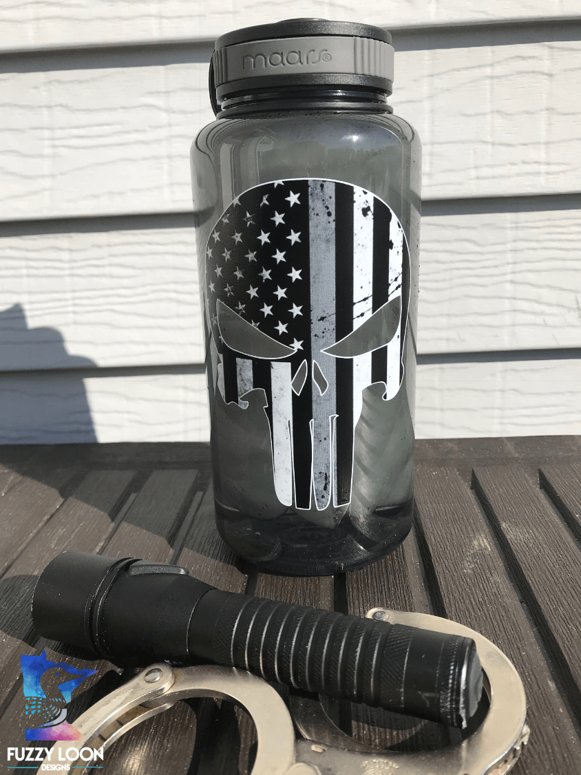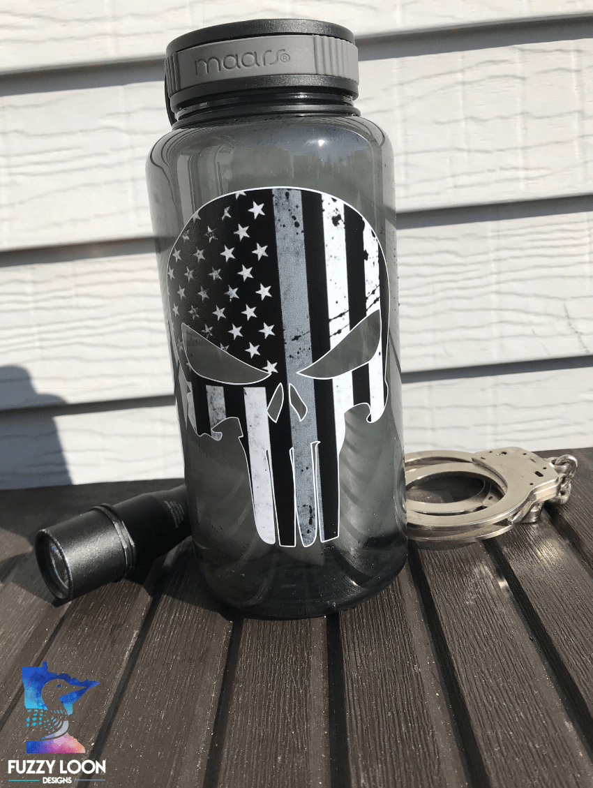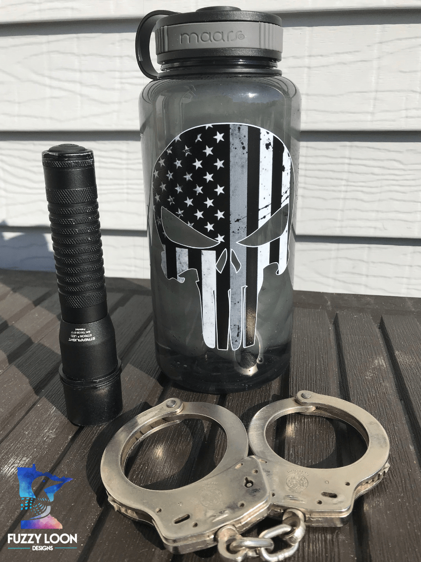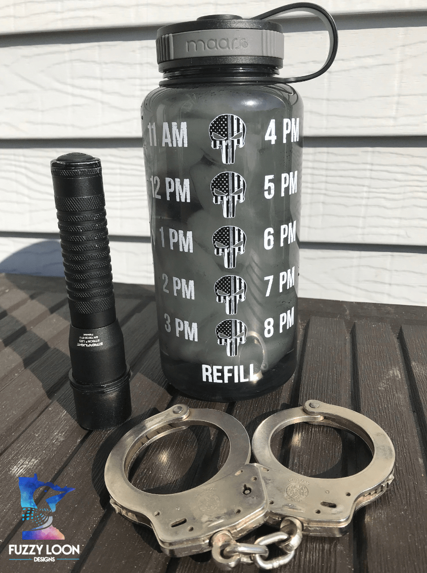 This thin grey line themed water bottle is perfect for any Corrections Officer. The front has a punisher skull with a thin grey line flag printed on it. The bottle is a charcoal grey or clear 34oz BPA free, plastic water bottle with twist off lid. Perfect to bring to work with you in a jail or prison. The design is printed with the newest UV printing technology.