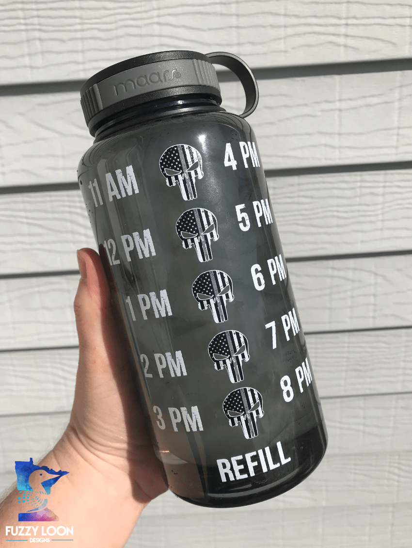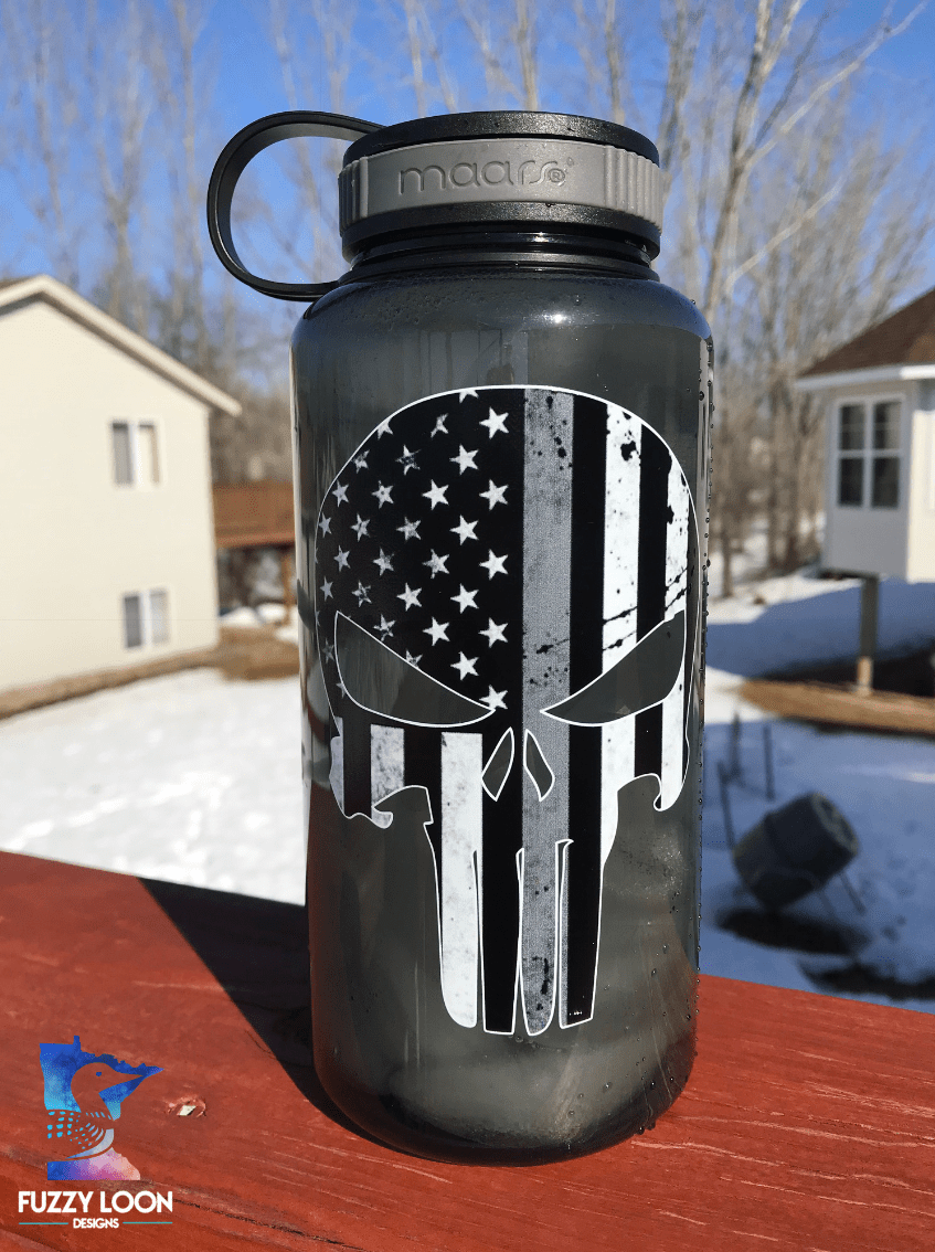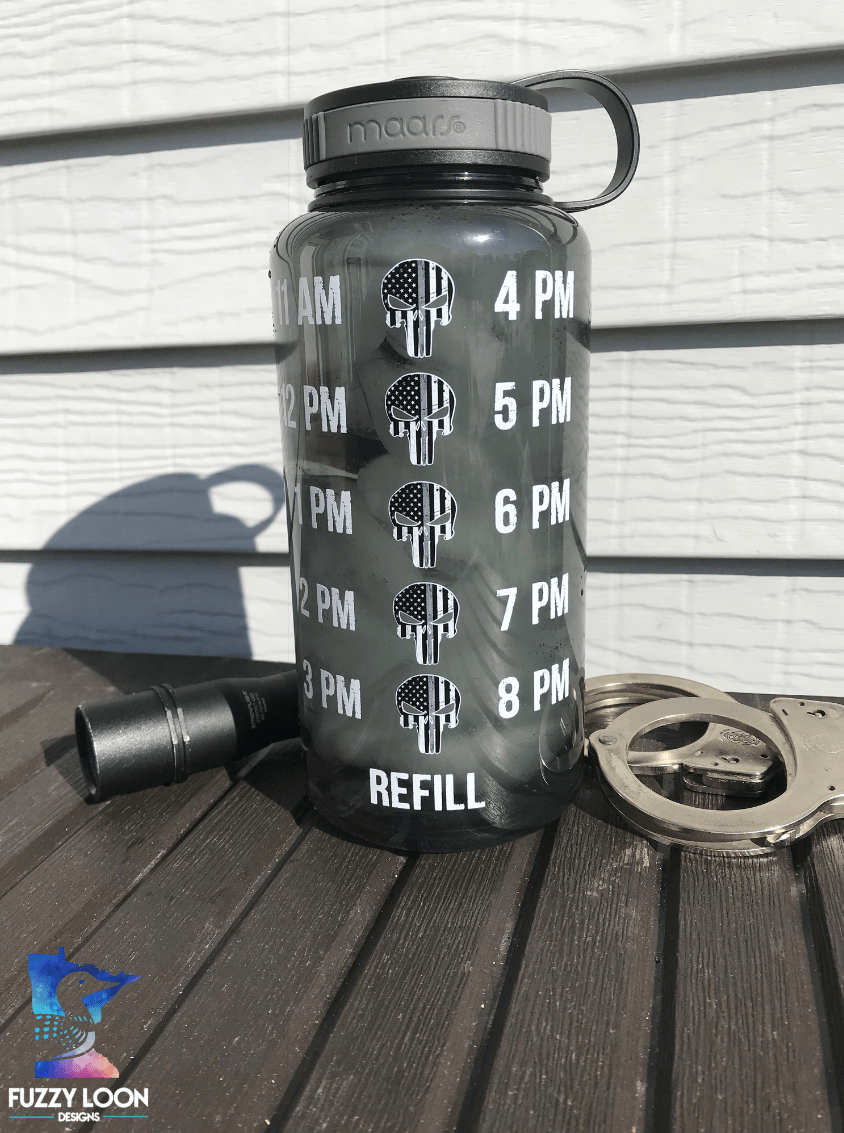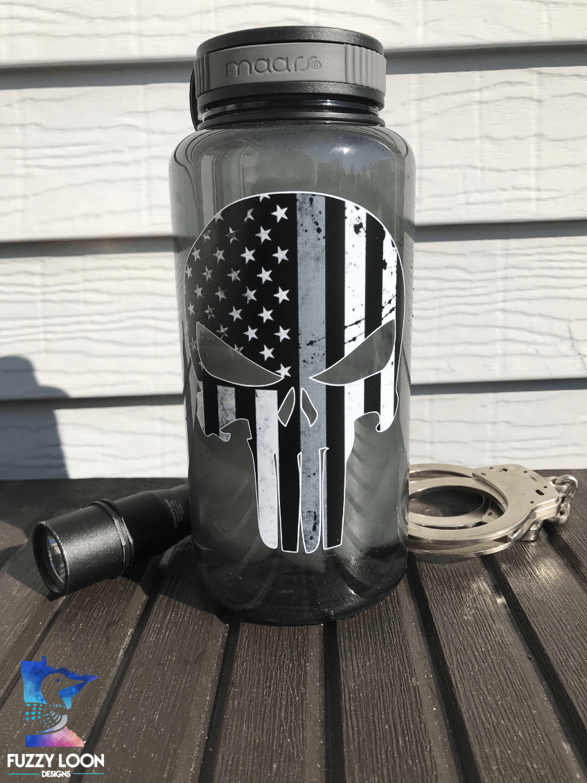 This thin grey line themed water bottle is perfect for any Corrections Officer. The front has a punisher skull with a thin grey line flag printed on it. The bottle is a charcoal grey or clear 34oz BPA free, plastic water bottle with twist off lid. Perfect to bring to work with you in a jail or prison. The design is printed with the newest UV printing technology.