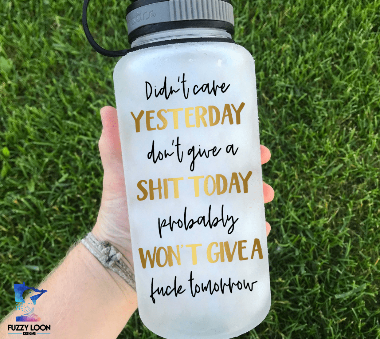 This motivational water bottle keeps your friends laughing and you drinking water all day long. "Didn't Care Yesterday, Don't Give a Shit Today, Won't Give A Fuck Tomorrow" Printed with gold and black colors on your choice of 34oz Water Bottle.