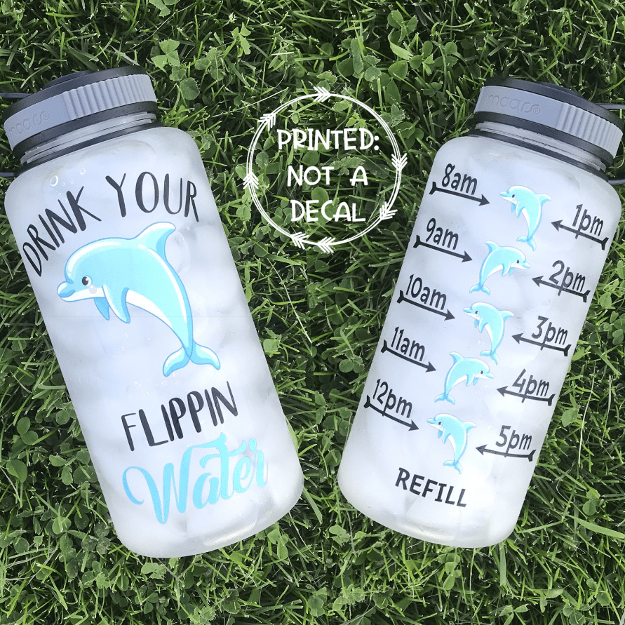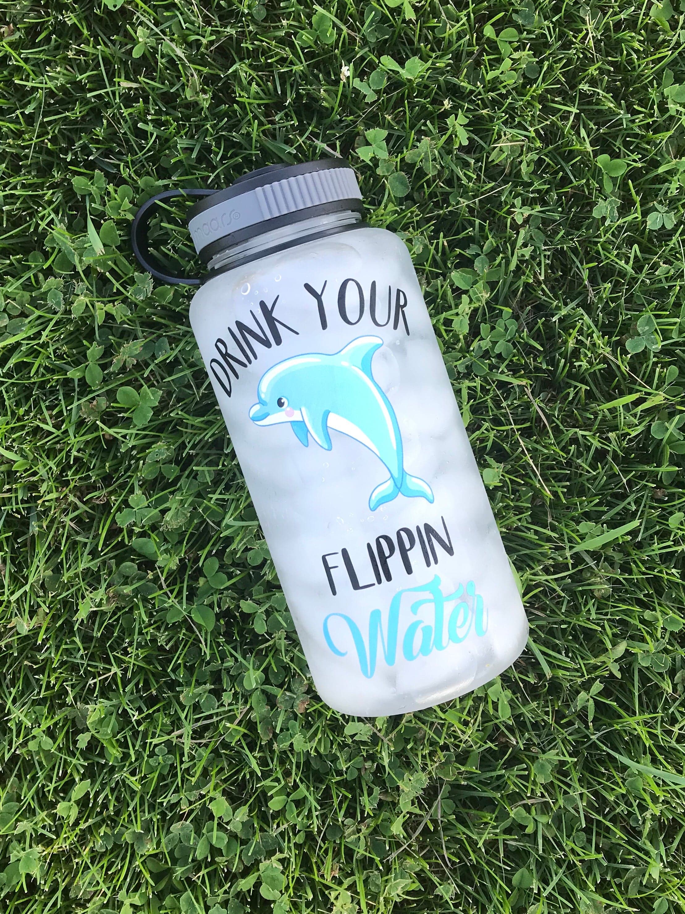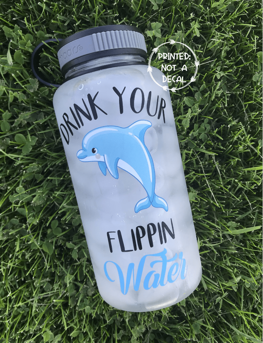 "Drink Your Flippin Water" is printed with a cute dolphin on a CLEAR 34oz single wall Eastman Tritan™ water/sport bottle.