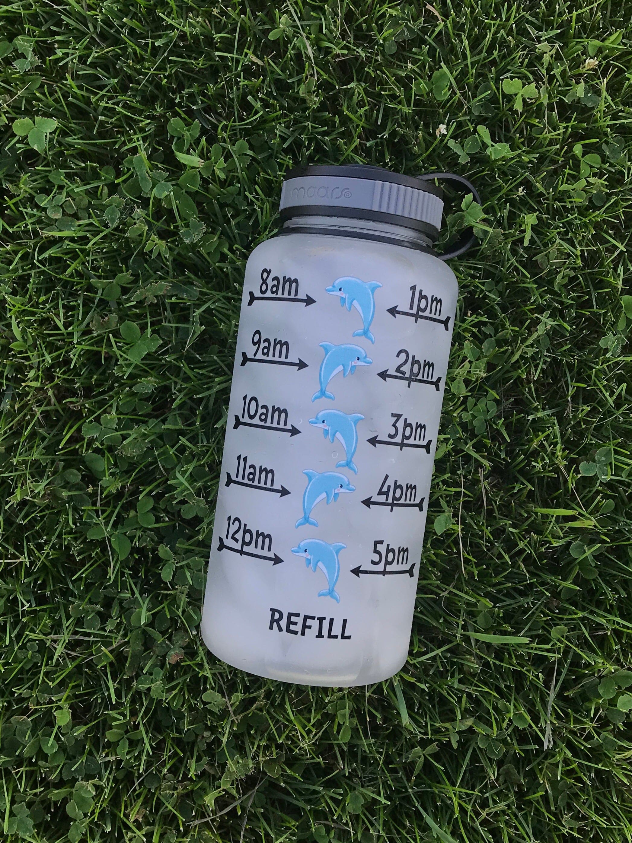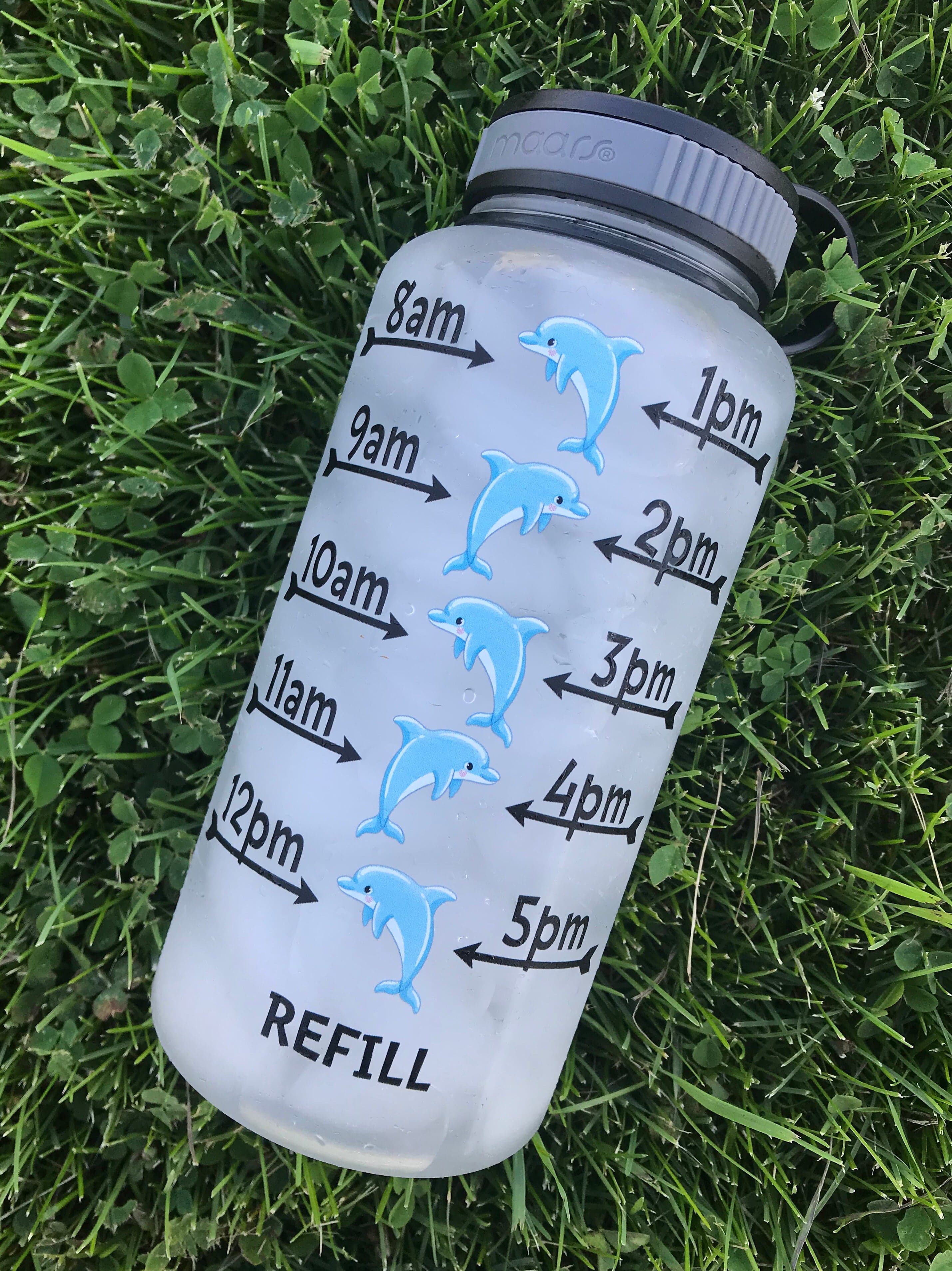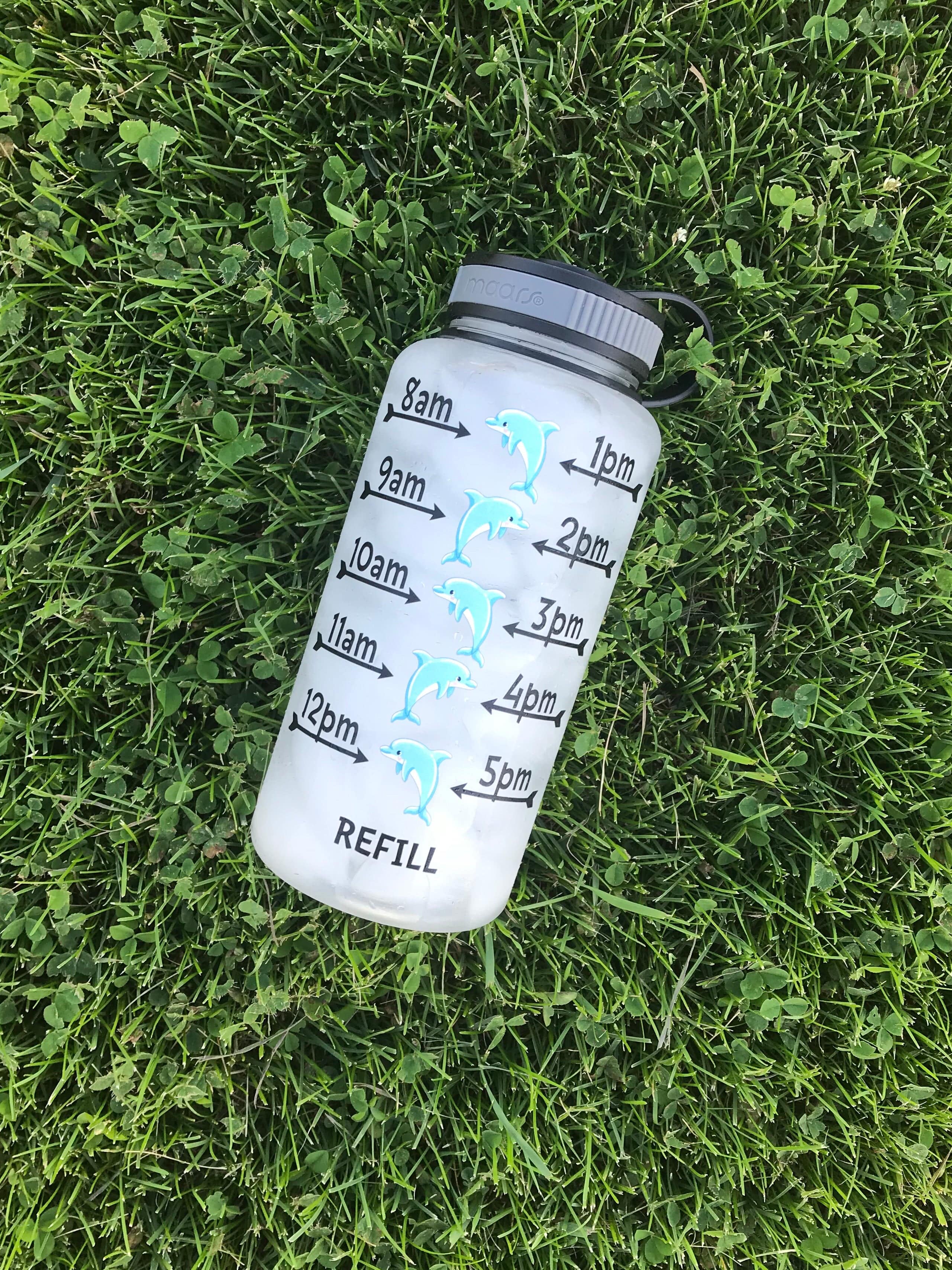 "Drink Your Flippin Water" is printed with a cute dolphin on a CLEAR 34oz single wall Eastman Tritan™ water/sport bottle.