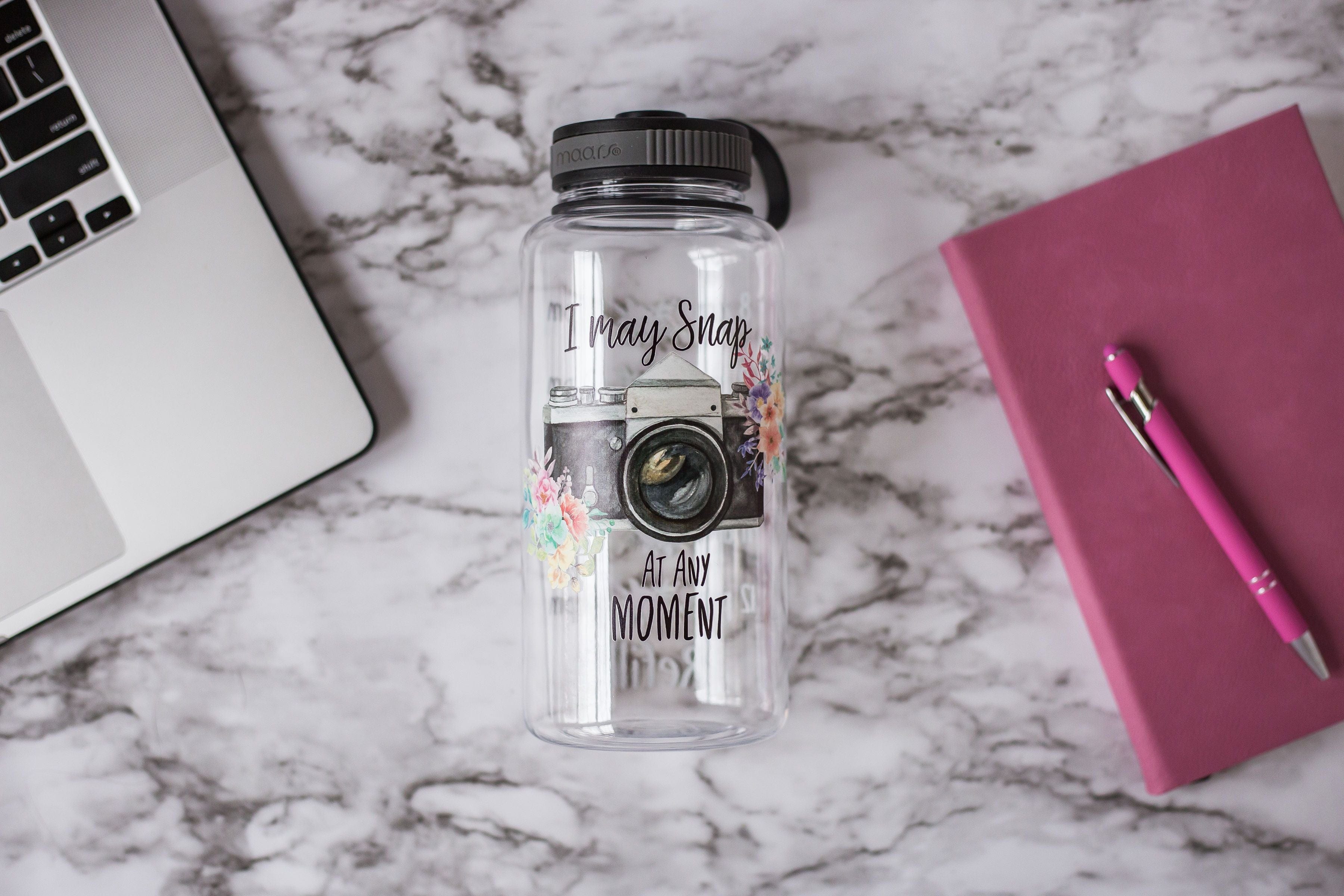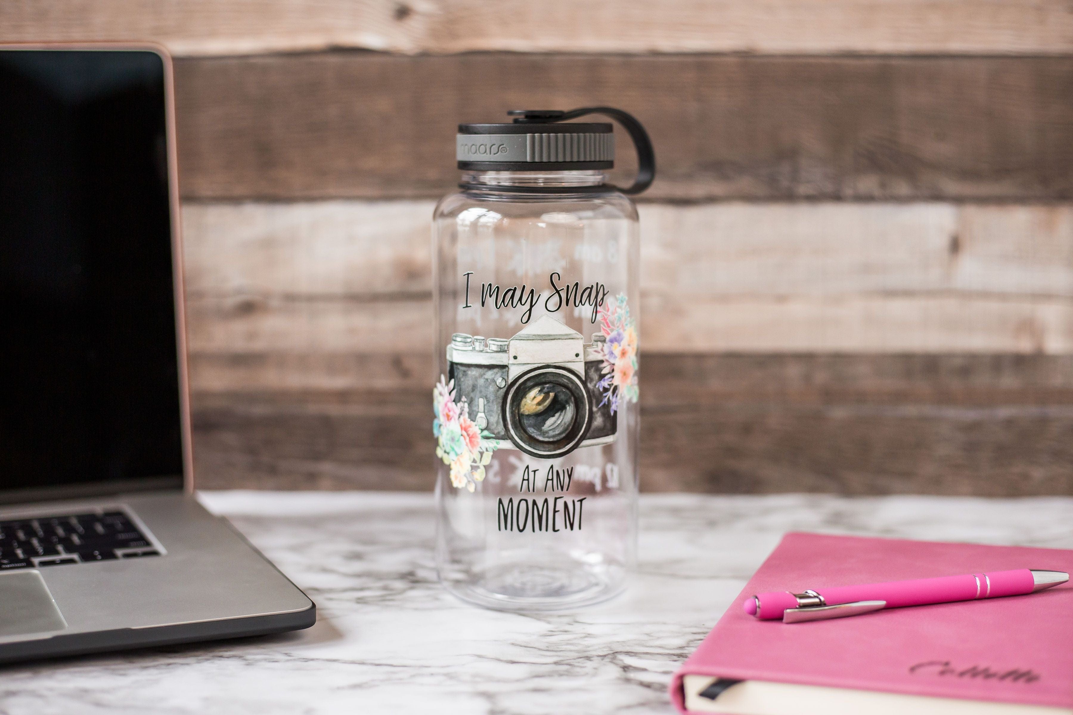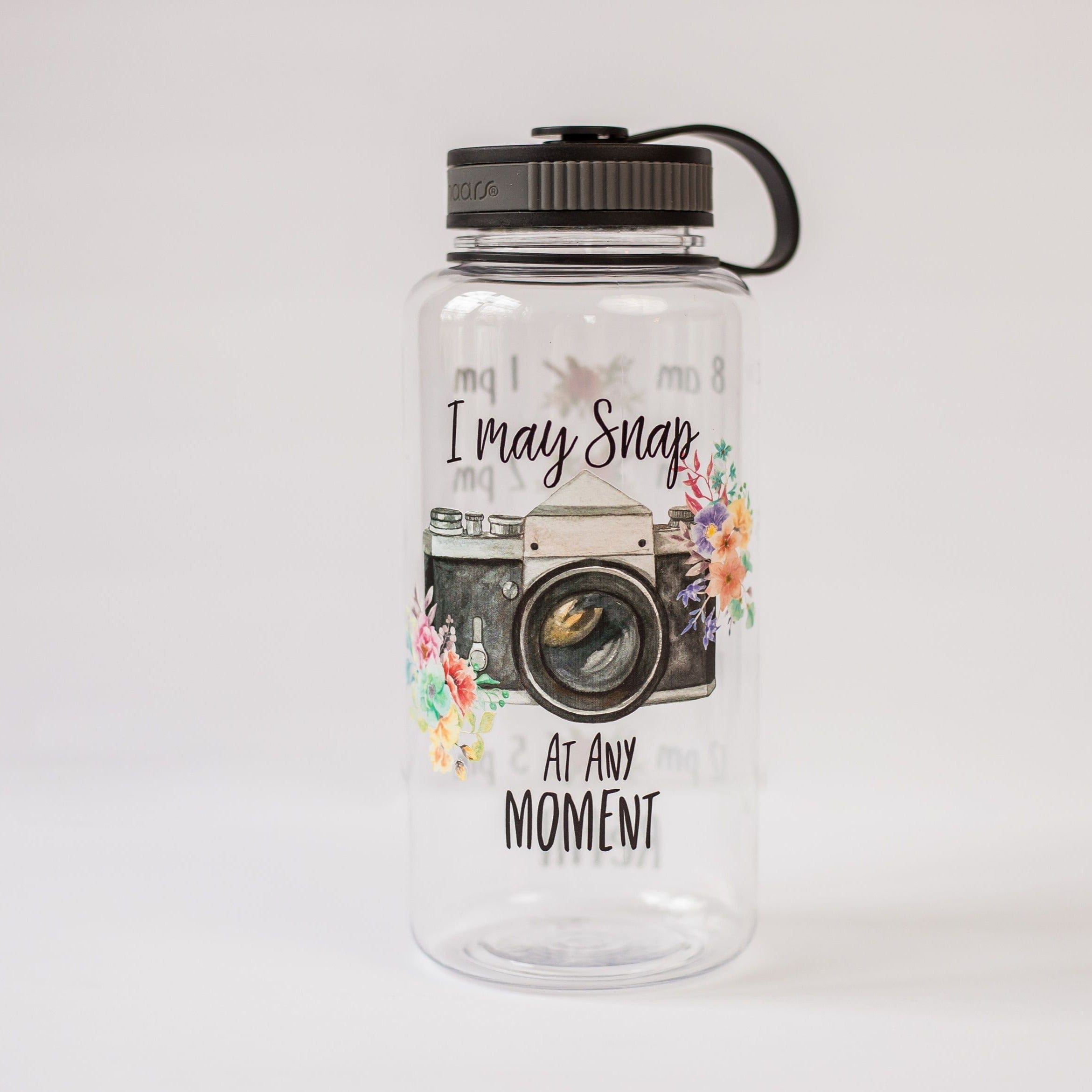 "I May Snap A Any Moment” printed with beautiful water color camera and flowers on a CLEAR water bottle.