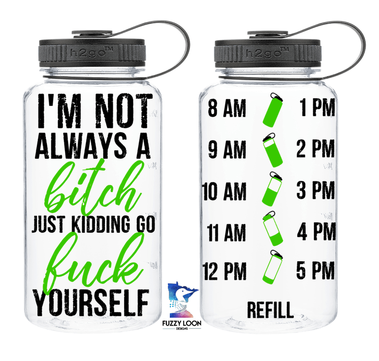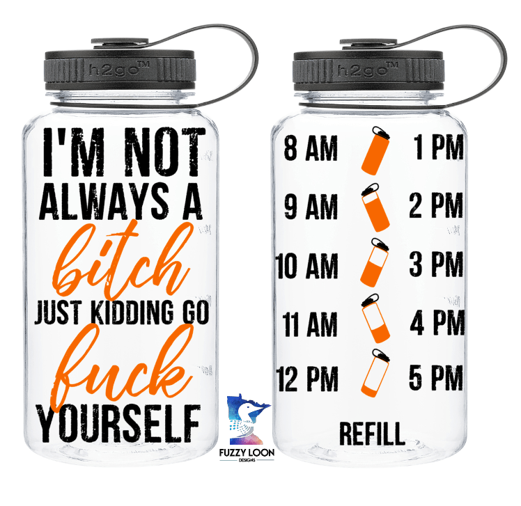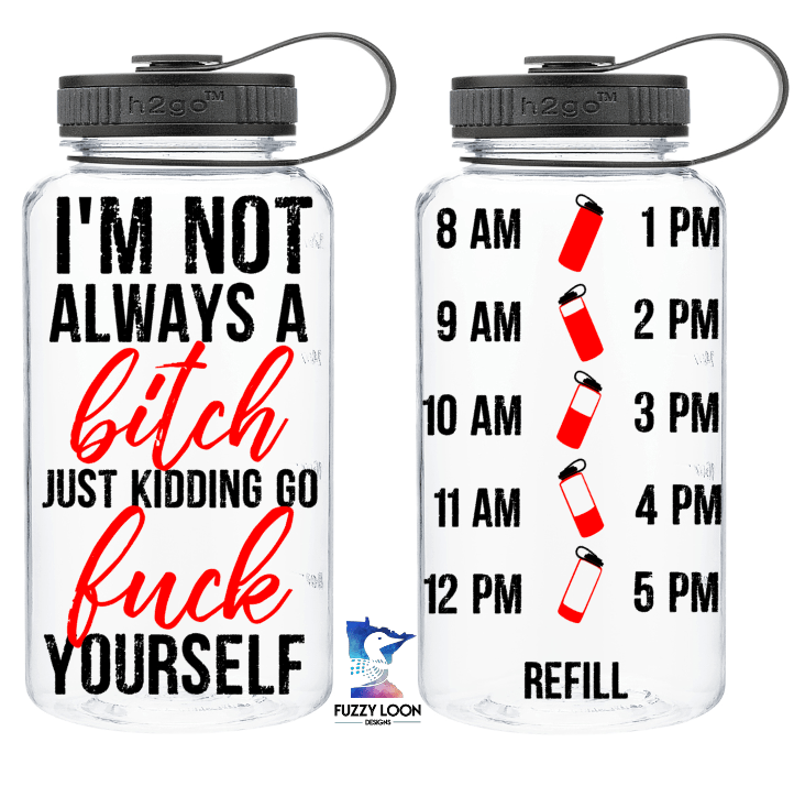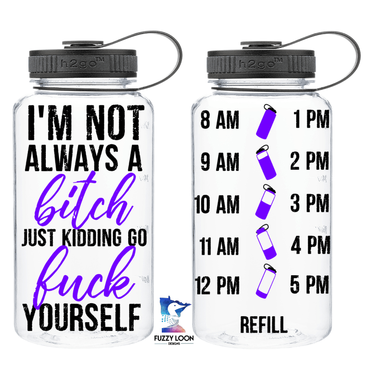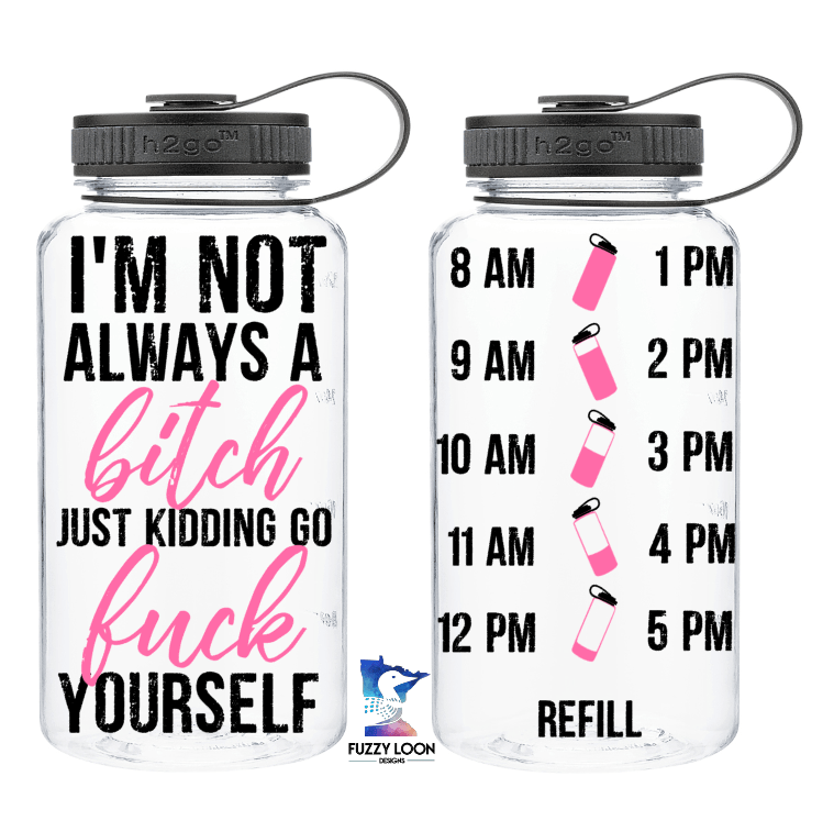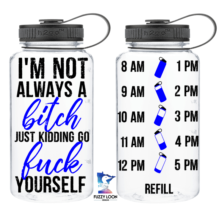 "I'm Not Always A Bitch, Just Kidding, Go Fuck Yourself" printed on a CLEAR water bottle in your choice color font.