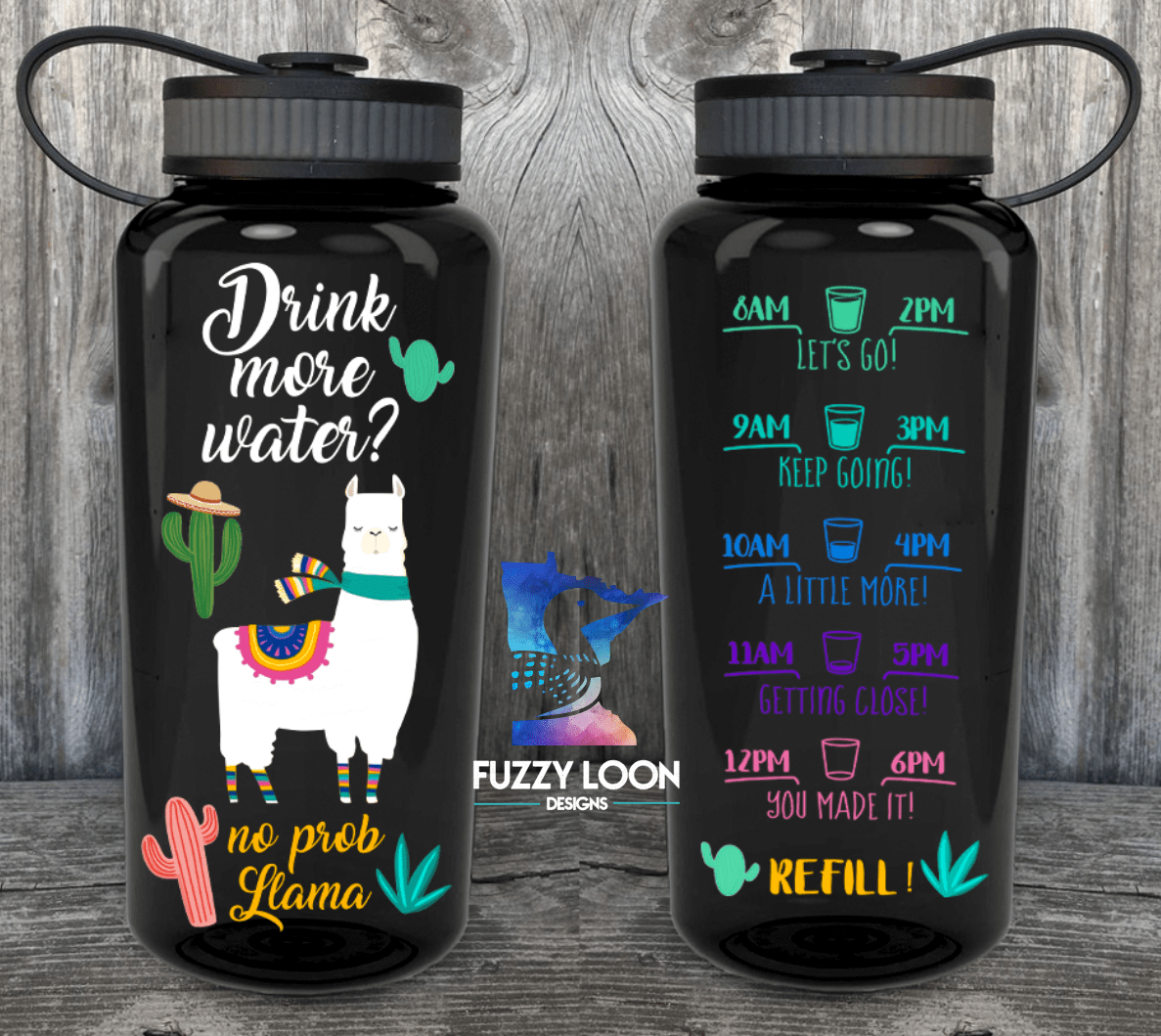 This motivational water bottle is perfect for any llama lover. "Drink More Water? No Prob-Llama" printed with a cute little llama on a dark colored bottle of your choice.