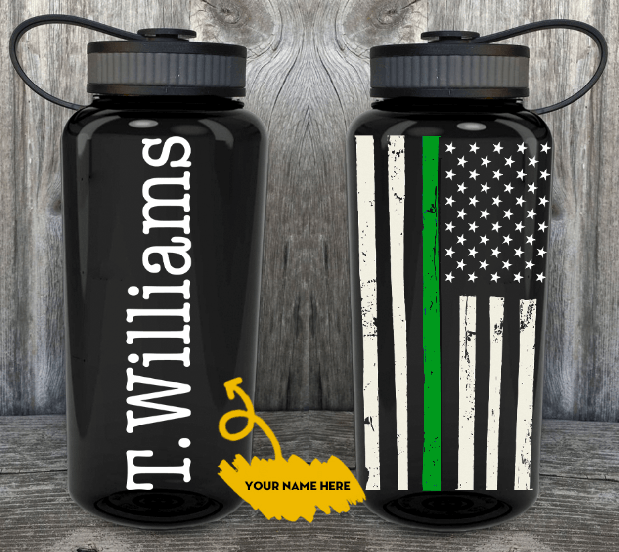 The bottle is a 34oz single wall Eastman Tritan™ water/sport bottle. Tritan is a tough, shatter-resistant, 100% BPA free copolyester that can withstand sub-freezing and boiling temperatures. The black plastic twist-on cap is attached to the bottle via a tethered strap.