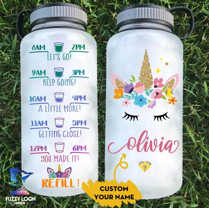 This unicorn themed motivational water bottle is perfect for anyone who needs that little bit of motivation. A pretty unicorn face with your name printed under. A rainbow time tracker on the back for drinking water all day long.