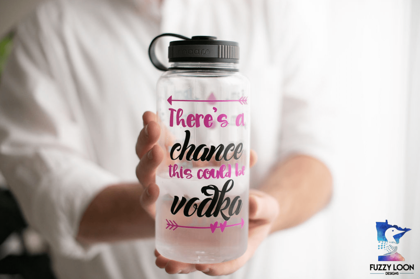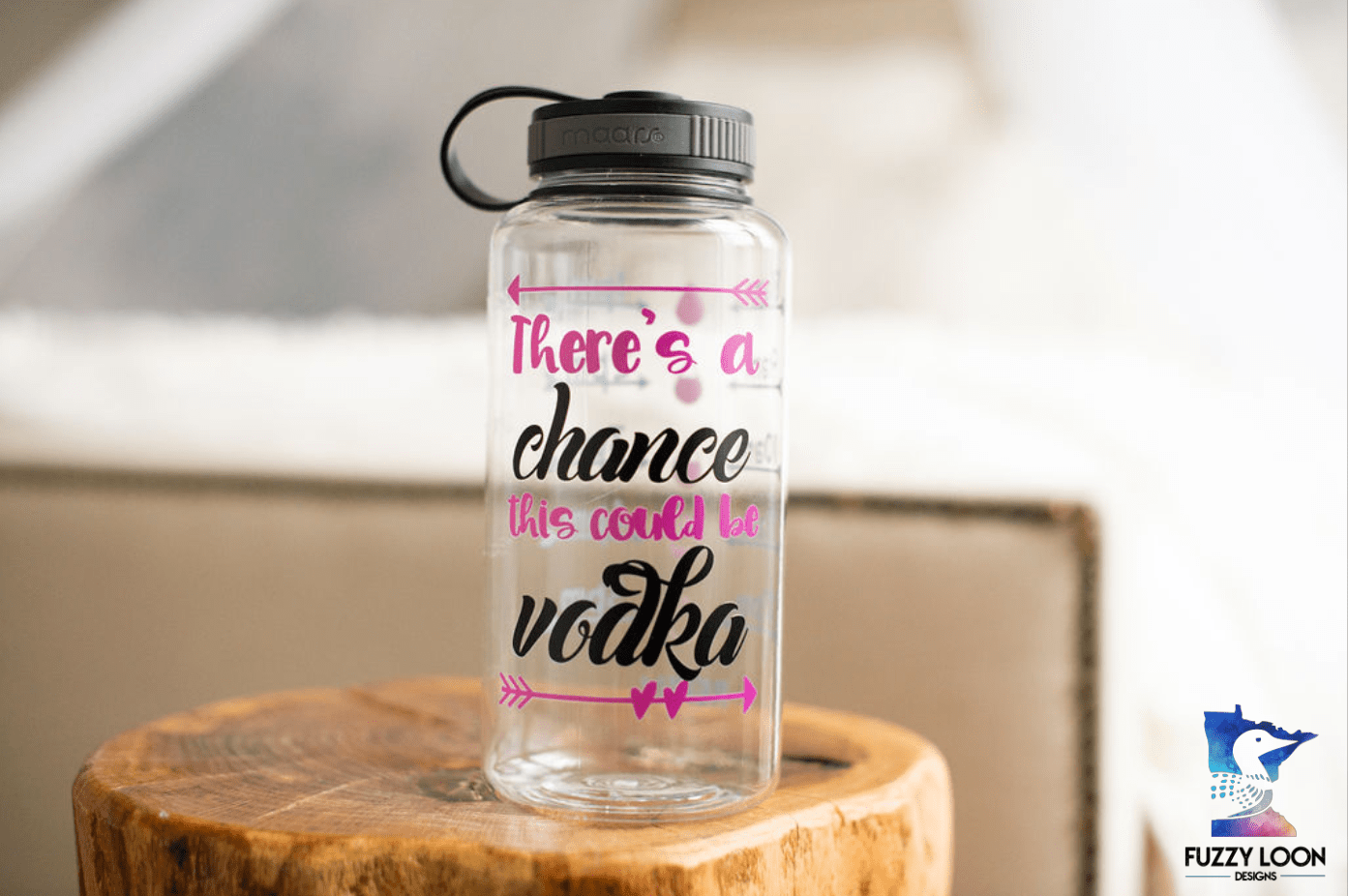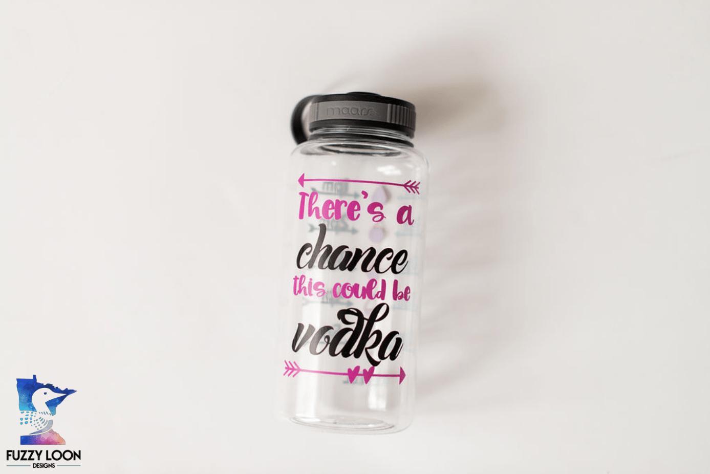 "There's A Chance This Could Be Vodka" is a 34oz single wall Eastman Tritan™ water/sport bottle. Tritan is a tough, shatter-resistant, 100% BPA free copolyester that can withstand sub-freezing and boiling temperatures. The black plastic twist-on cap is attached to the bottle via a tethered strap.