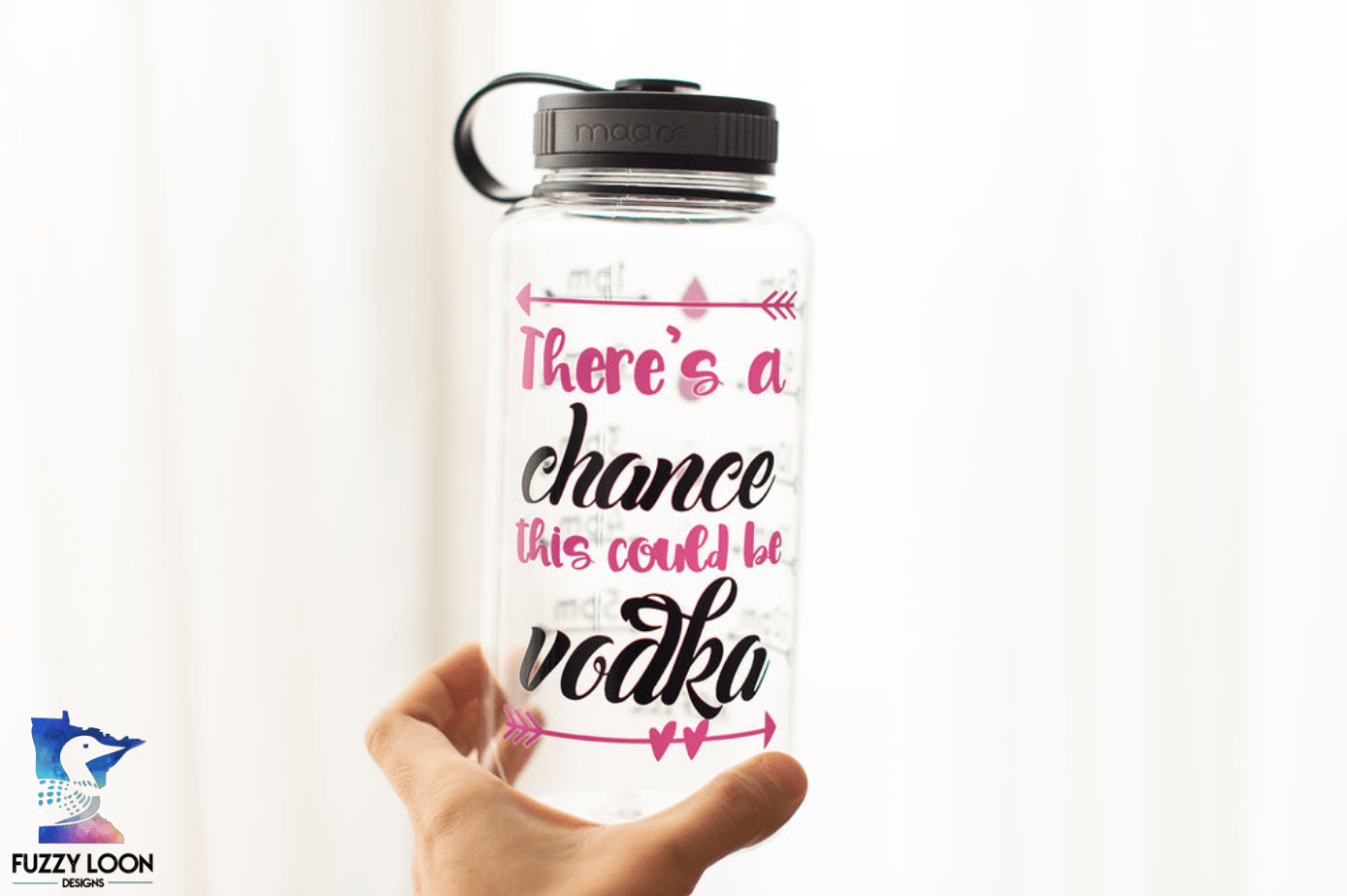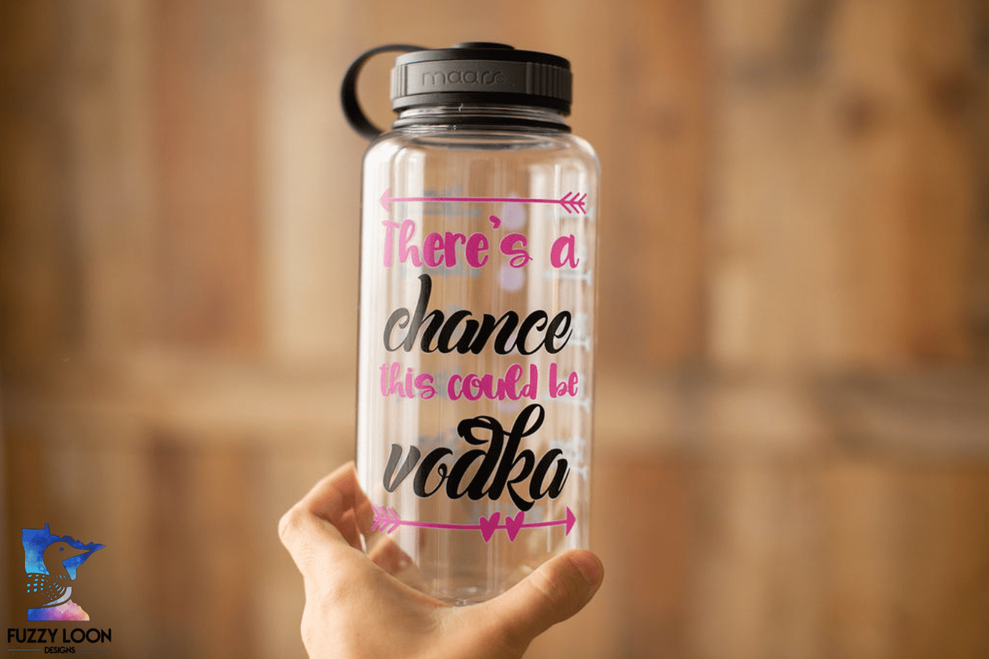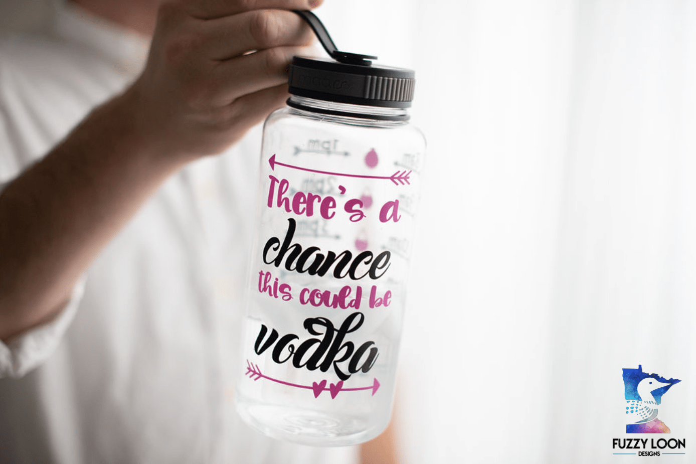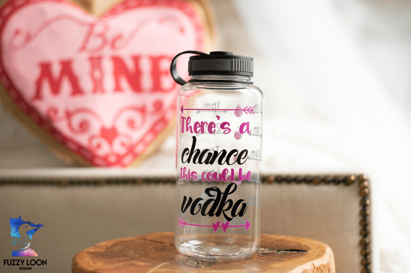 "There's A Chance This Could Be Vodka" is a 34oz single wall Eastman Tritan™ water/sport bottle. Tritan is a tough, shatter-resistant, 100% BPA free copolyester that can withstand sub-freezing and boiling temperatures. The black plastic twist-on cap is attached to the bottle via a tethered strap.