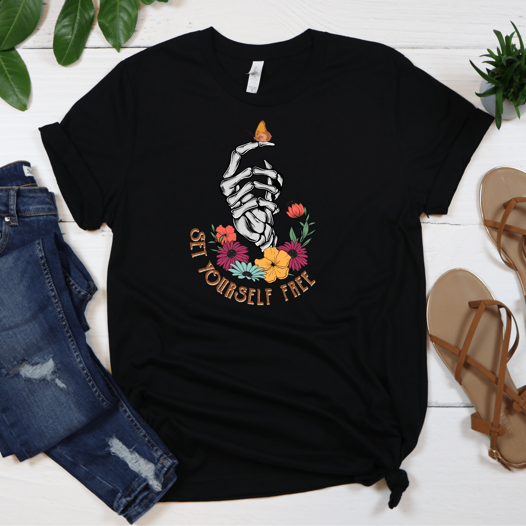 Set Yourself Free Shirt with a skeleton hand holding a butterfly