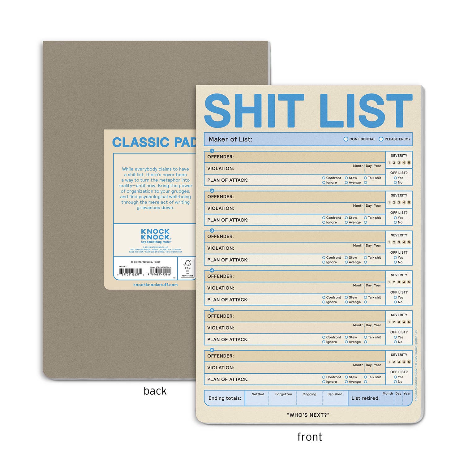 Everybody has a shit list—now you can put it on paper! This desk notepad helps you track grudges with the organizational clarity of a spreadsheet, while enjoying the therapeutic benefits of writing it all down.
