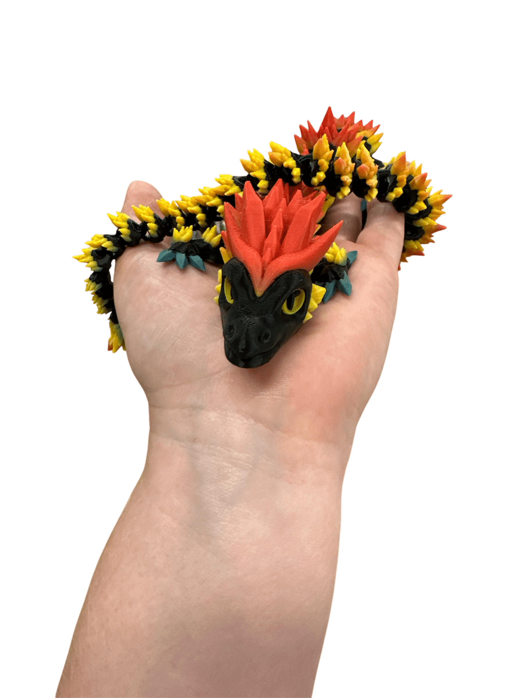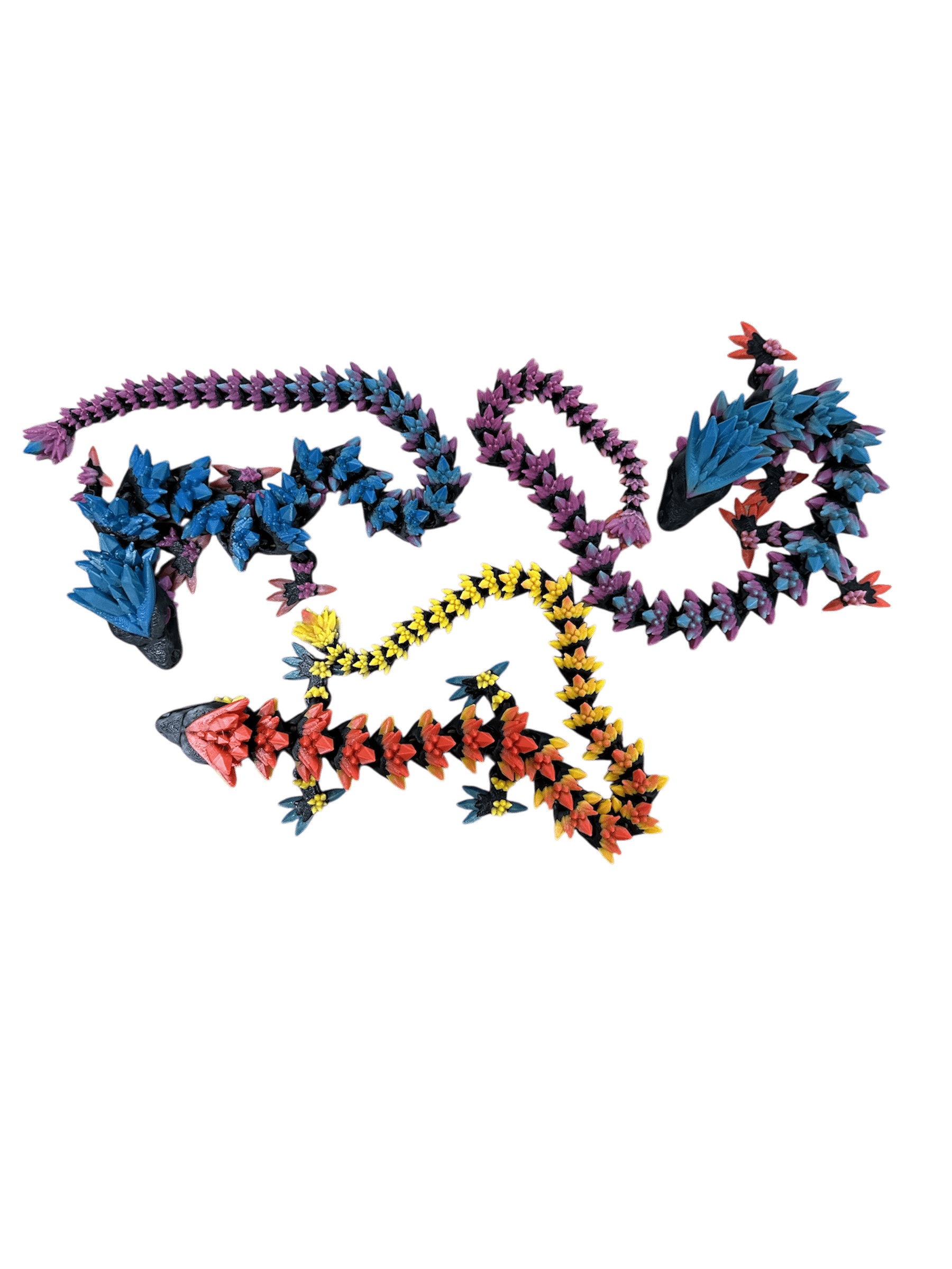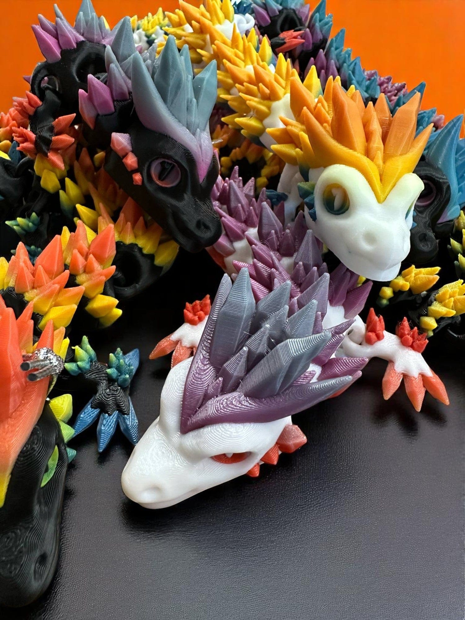 Bring a little magic to your shelf with your very own 3D printed dragon! These articulated crystal dragons are flexible, satisfying to fidget with, and perfect for sensory play. Each one is printed in vibrant colors with gem-like texture details — ready to guard your desk, perch on a bookshelf, or spark conversation at your next event.