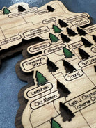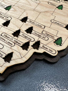 Decorated with an outdoorsy theme, these maps come with adhesive-backed trees to mark your journeys. Each map is unique since they are made from wood. The front of the map is a lighter wood tone, the backing is a darker tone.