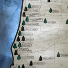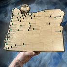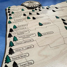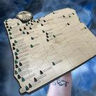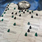 Decorated with an outdoorsy theme, these maps come with adhesive-backed trees to mark your journeys. Each map is unique since they are made from wood. The front of the map is a lighter wood tone, the backing is a darker tone.