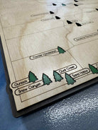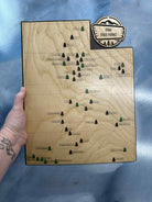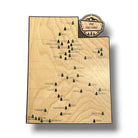 Decorated with an outdoorsy theme, these maps come with adhesive-backed trees to mark your journeys. Each map is unique since they are made from wood. The front of the map is a lighter wood tone, the backing is a darker tone.