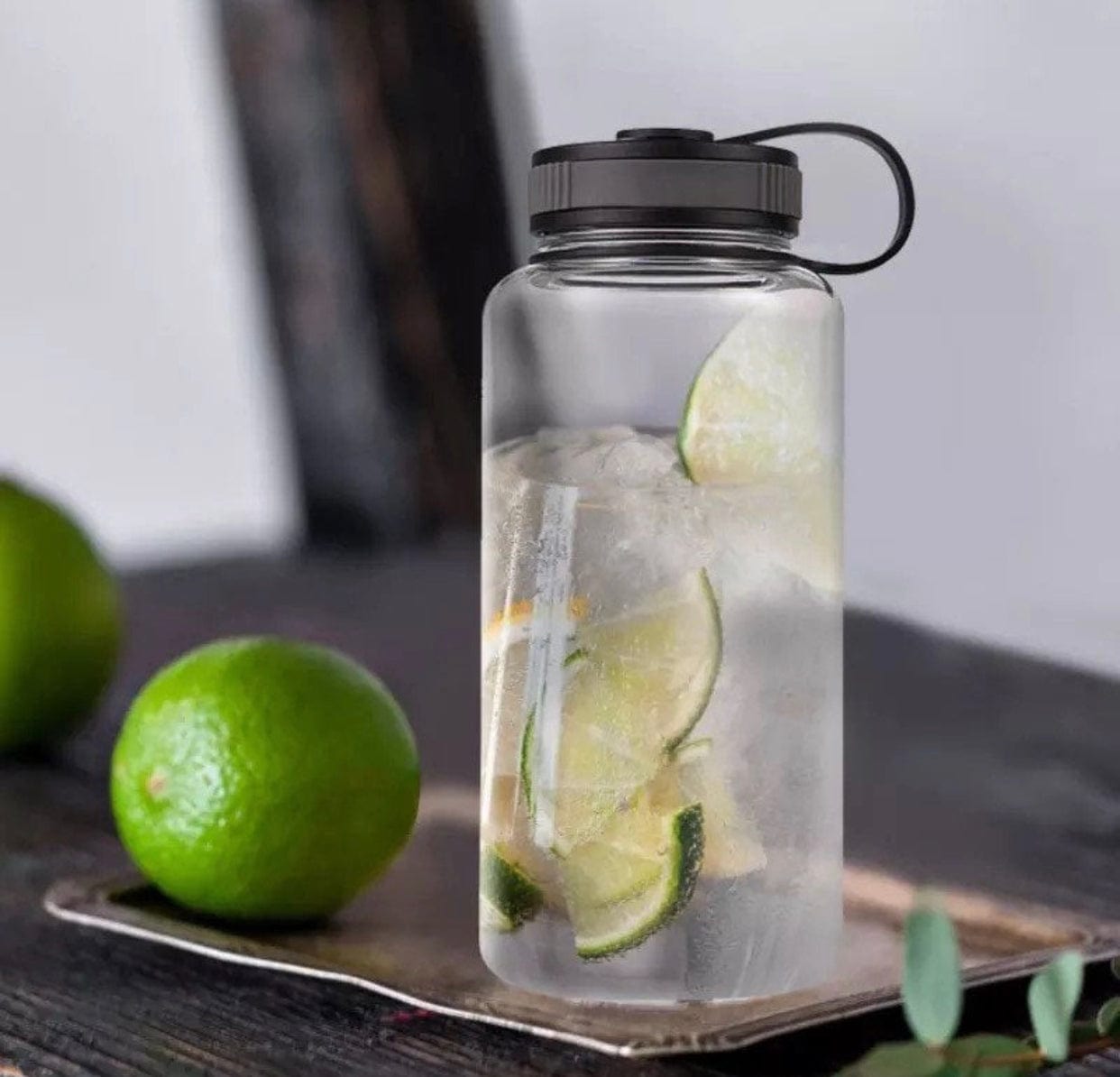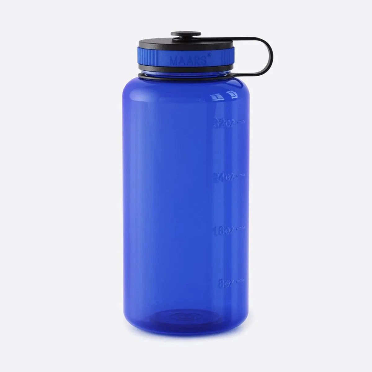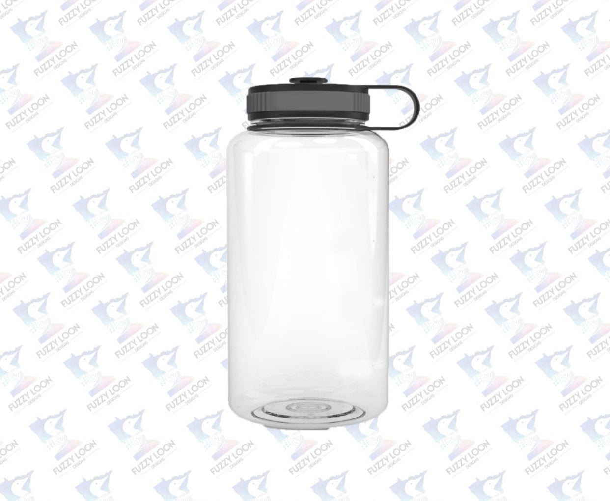 The bottle is a 34oz single wall Tritan™ water/sport bottle. Tritan is a tough, shatter-resistant, 100% BPA free copolyester that can withstand sub-freezing and boiling temperatures. The black plastic twist-on cap is attached to the bottle via a tethered strap. The bottle does not have any raised markings perfect for adding your own personalizations.