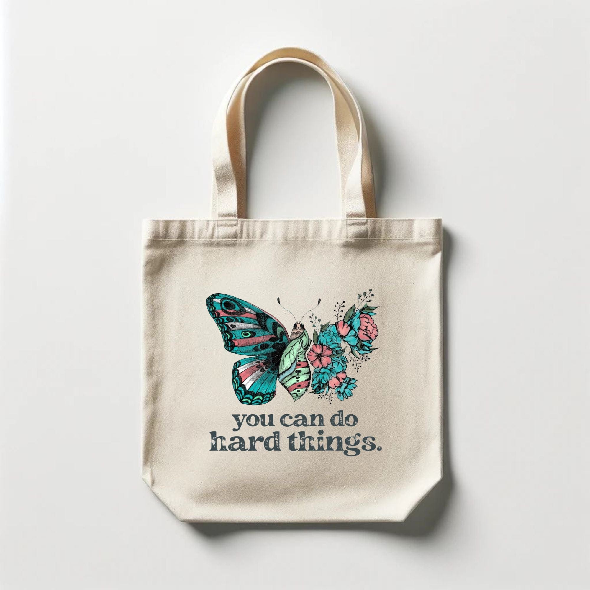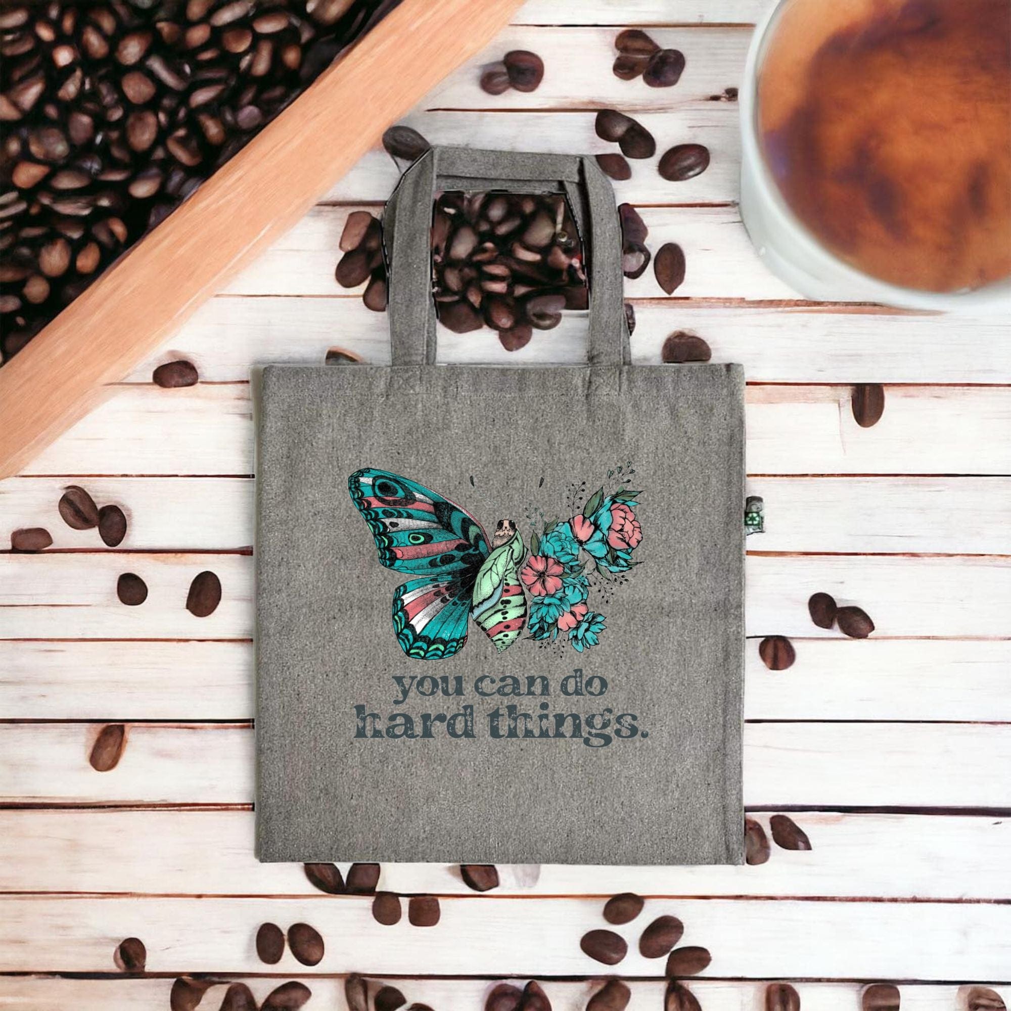 Our NEW canvas totes are made of 10oz recycled canvas material, roughly 15"x16" with a flat bottom. Reinforced at stress points. Because totes are made with recycled material and of fabric texture, color may differ slightly.