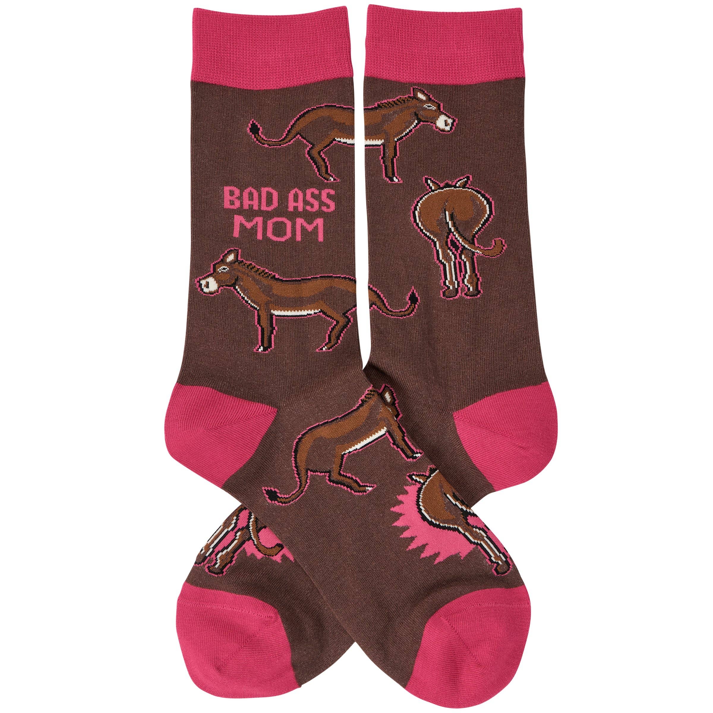 From our Mother's Day Collection, this vibrant pair of socks features hand-illustrated donkey designs and a bold, mom-inspired message: "Bad Ass Mom." Made from a soft cotton, nylon, and spandex blend, they offer a comfortable one-size-fits-most fit. Complete with a decorative header card and a clear plastic hanger, they’re perfect for easy gifting and display. A fun and unique Mother’s Day gift for moms who embrace their inner badass every day!