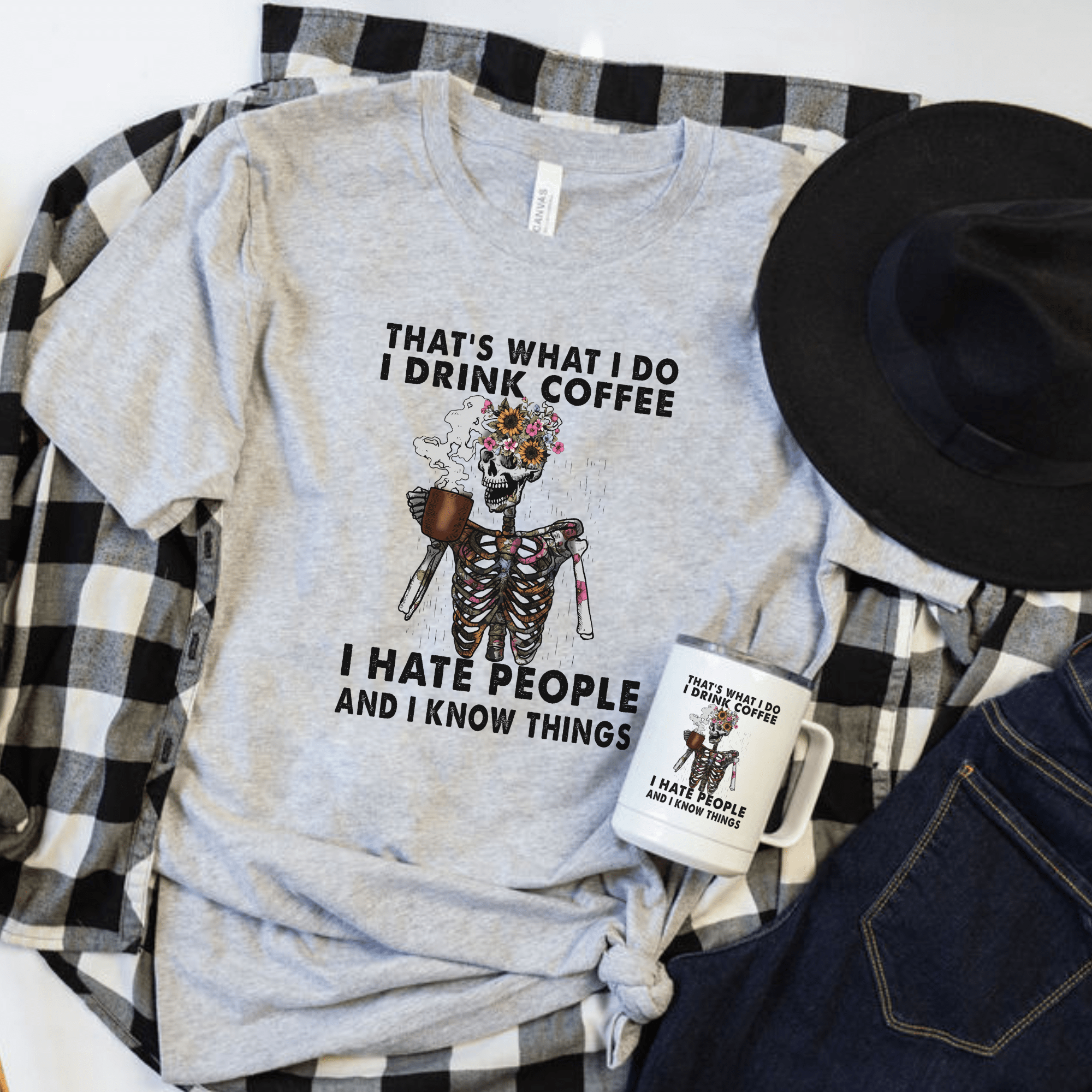 Perfect for anyone who loves to be snarky. Unapologetic skeleton saying, "I drink coffee, I hate people, and I know things."