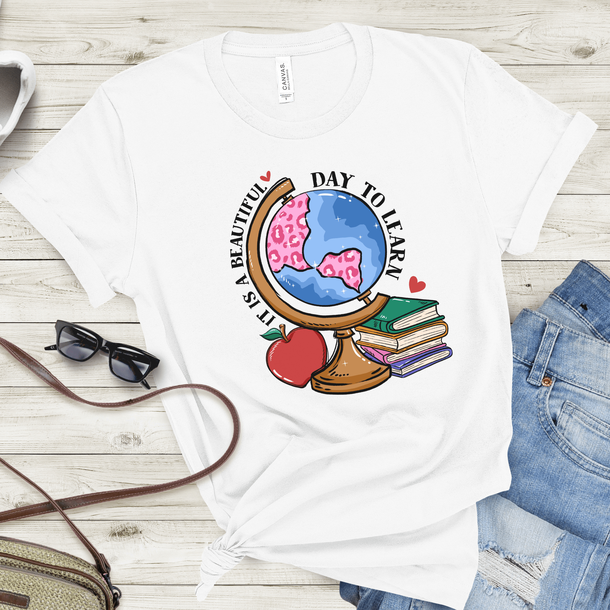 This It's a Beautiful Day to Learn T-Shirt reminds us to never stop exploring the world around us. With a globe, apple, and books graphic, it's an inspirational reminder to keep learning.