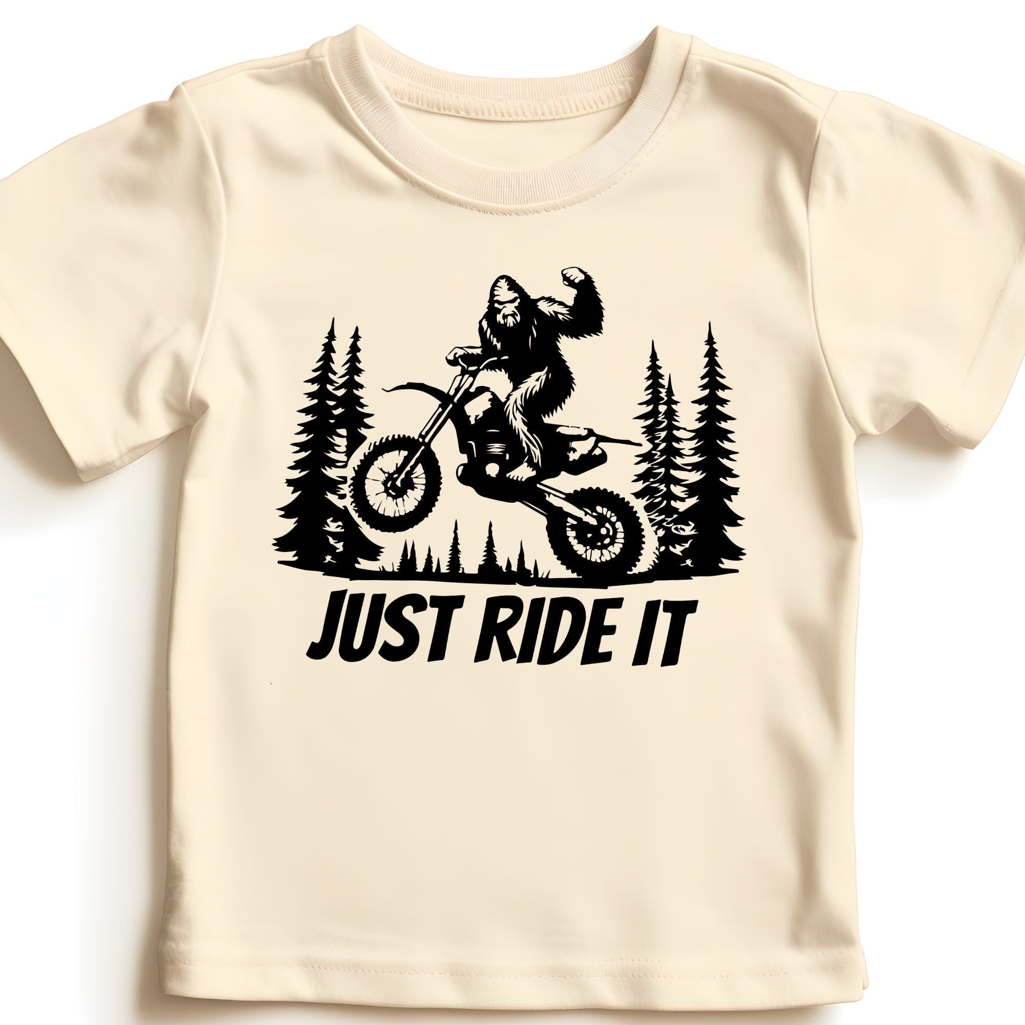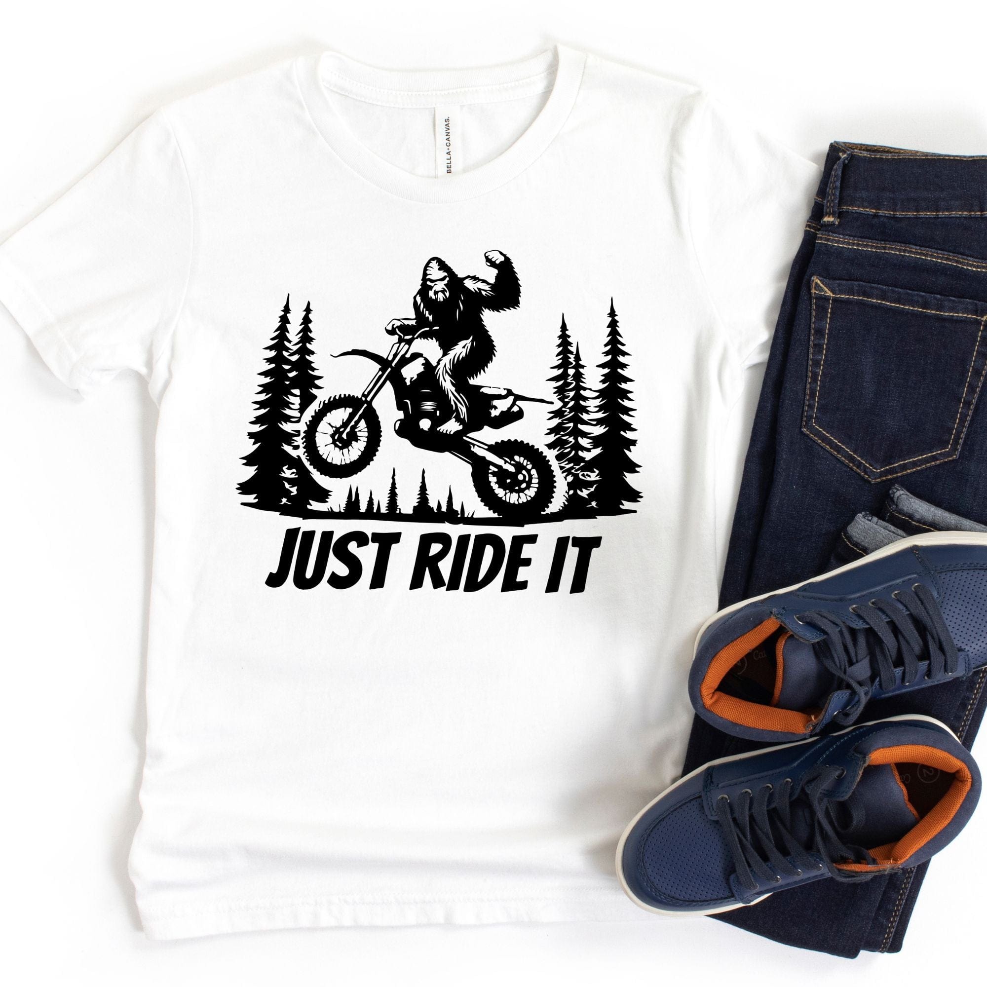 Just Ride It with this Bigfoot Dirt Bike T-Shirt. Embrace the unexpected and unleash your wild side with this unique shirt that combines two passions - dirt biking and Bigfoot.
