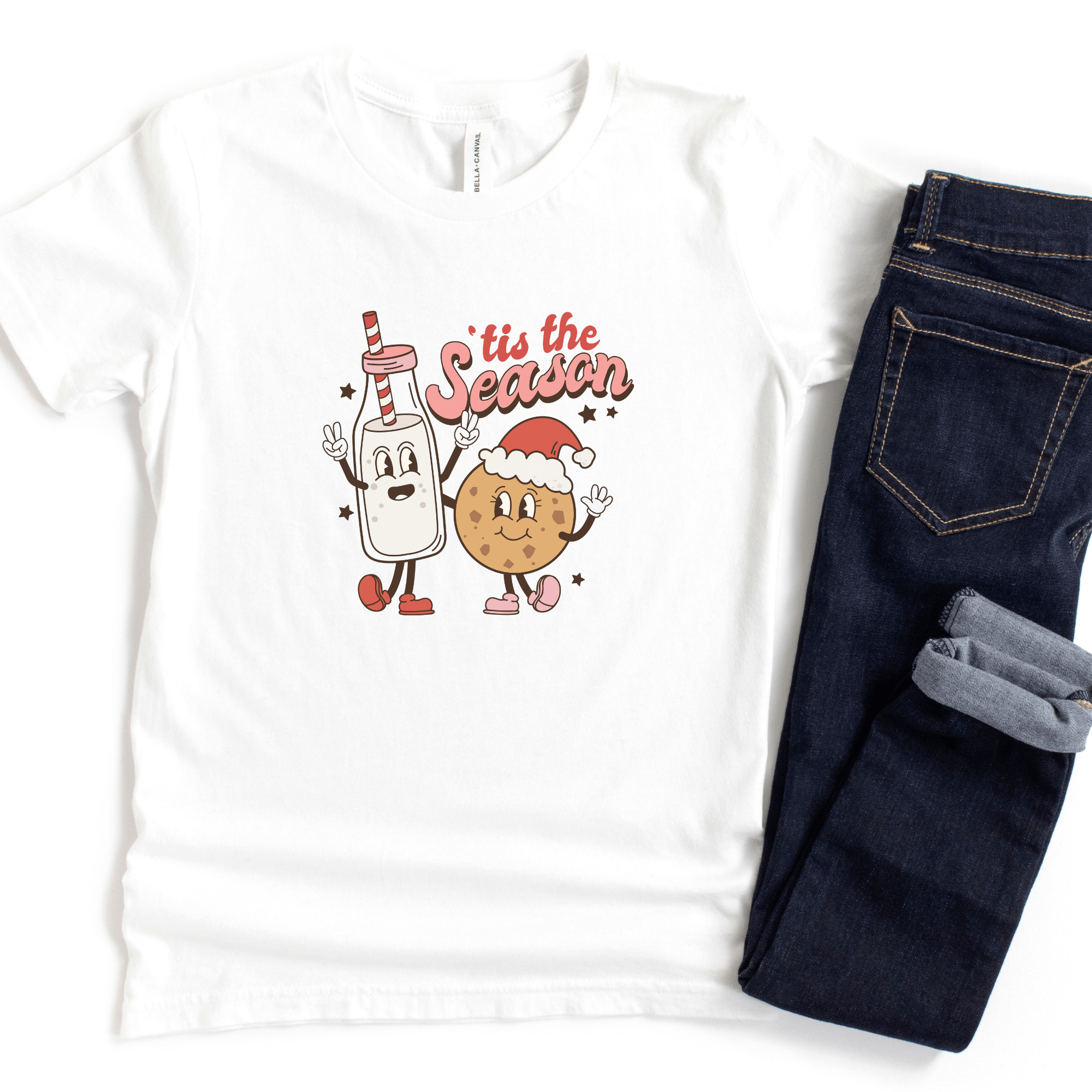 This adorable retro bottle of milk and Christmas cookie are adorable for a fun festive tee! Design reads 'tis the season in vintage style lettering.