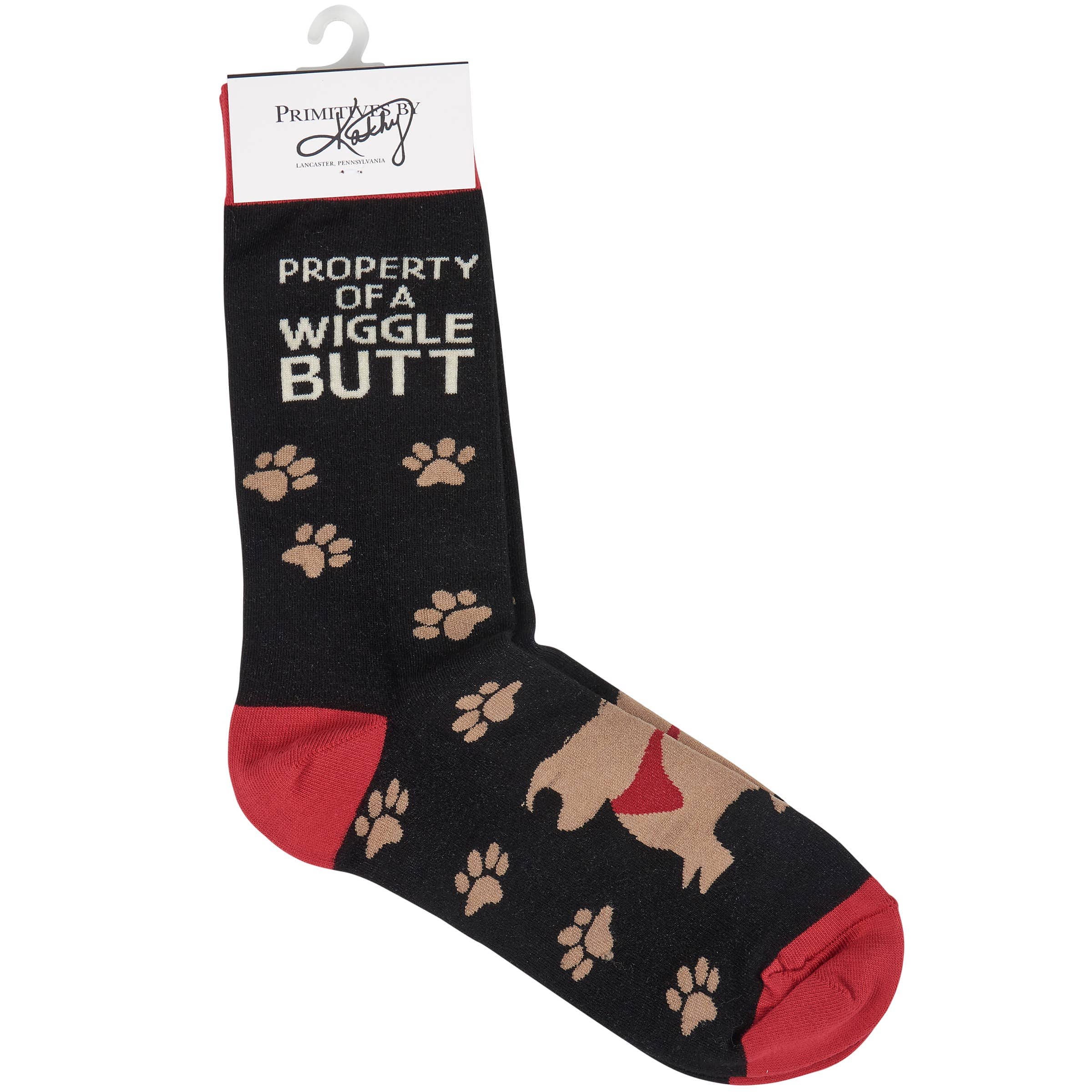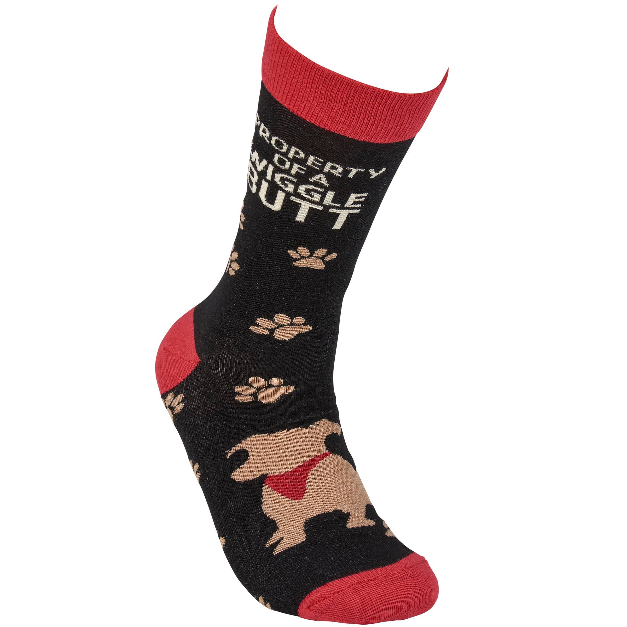 This vibrant pair of woven socks showcases a playful dog and paw print pattern along with the fun message: "Property Of A Wigglebutt." Made from a soft blend of cotton, nylon, and spandex, they offer a comfortable one-size-fits-most fit.