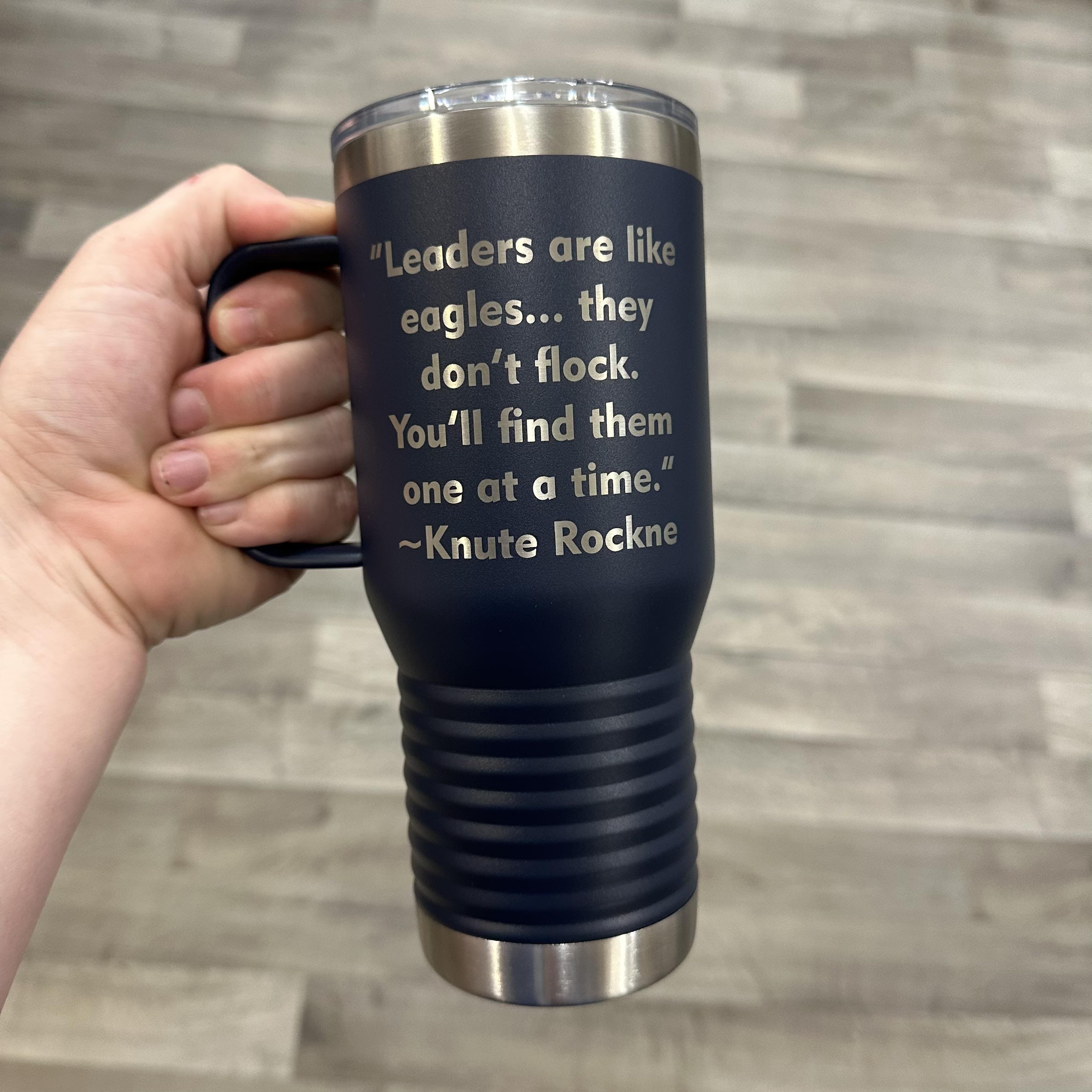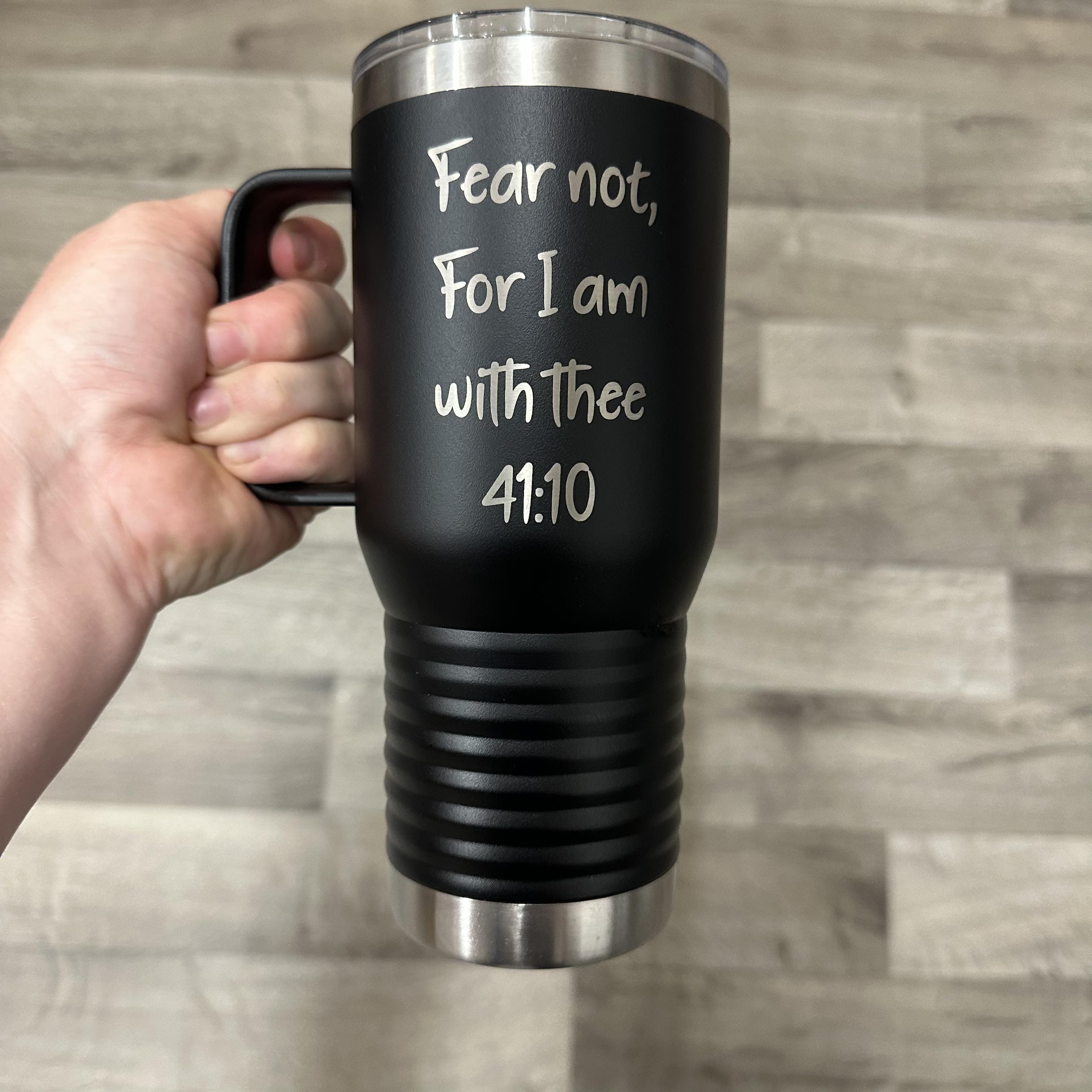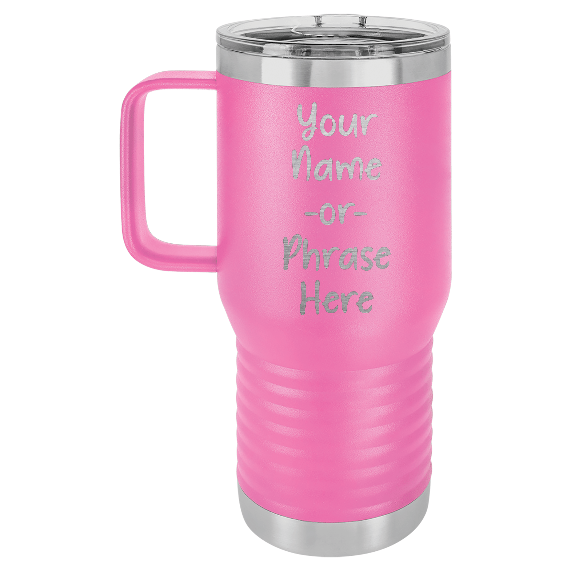 Now for a limited time - help us test a new product! These travel tumblers will fit in your cup holders in the car, and they are just like the tumblers you know and love already, but with a HANDLE! Choose your own phrase by typing whatever you wish us to engrave on your mug in the notes section. Keep in mind, the more words, the smaller the text.