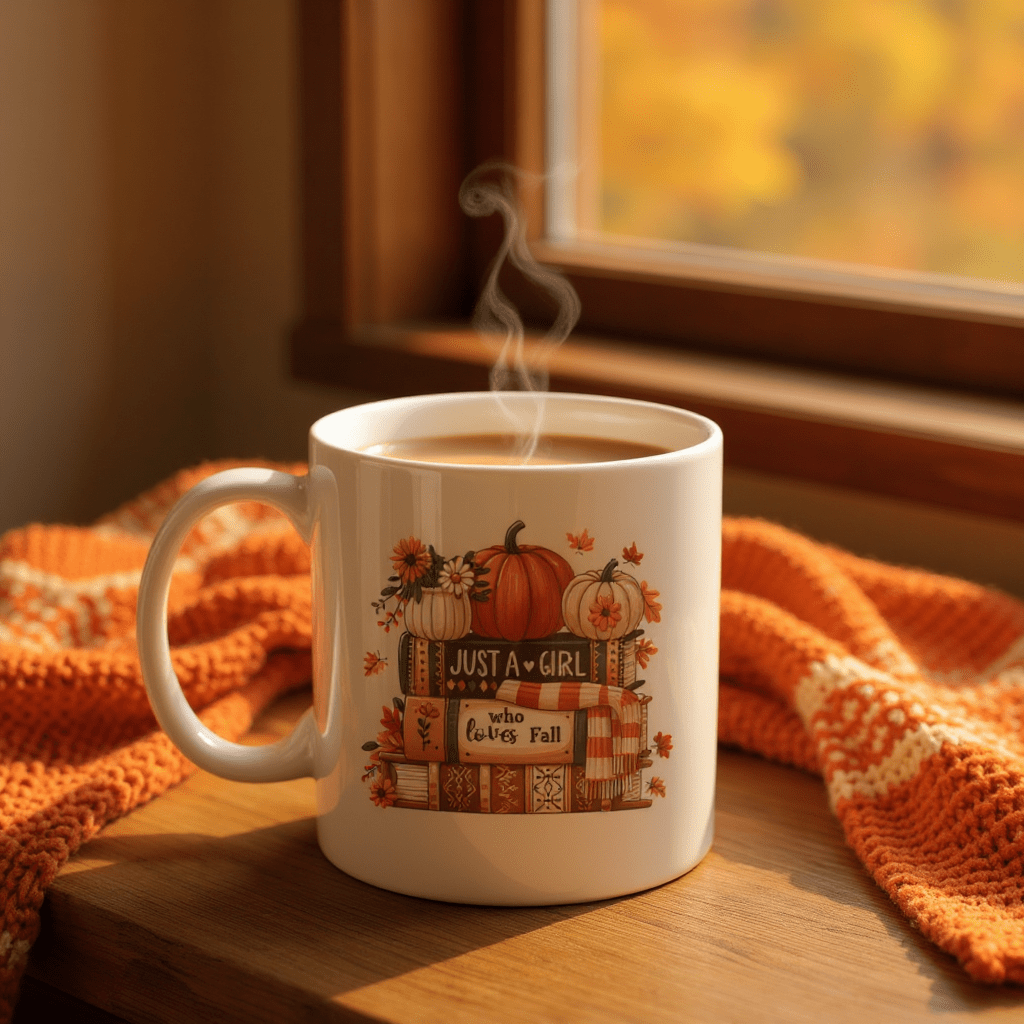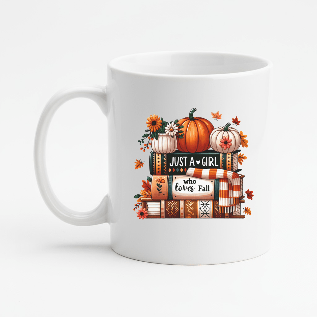 Celebrate your love of cozy autumn moments with the Just a Girl Who Loves Fall Mug. Featuring a charming design of fall pumpkins, flowers, and a stack of books, this mug is perfect for sipping your favorite warm beverage while enjoying a good read. Embrace the spirit of the season every morning and make your fall quieter and more comforting with this inviting mug. Ideal for yourself or as a thoughtful gift for any fall enthusiast.