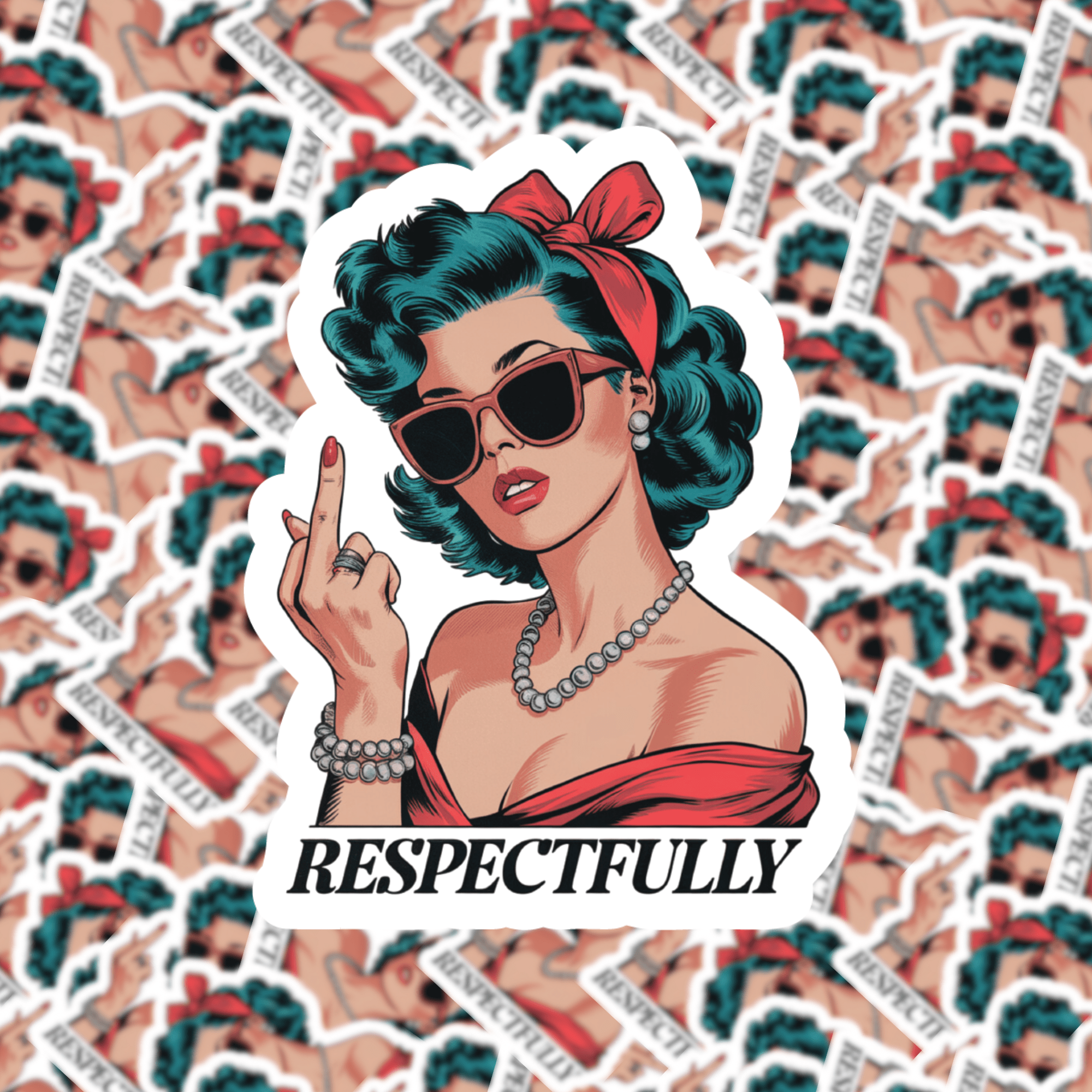 Make a statement with our Respectfully Sticker featuring a pin-up style girl donning sunglasses while cheekily showing the middle finger. Perfect for those who don't take themselves too seriously and want to add some playful attitude to any surface!