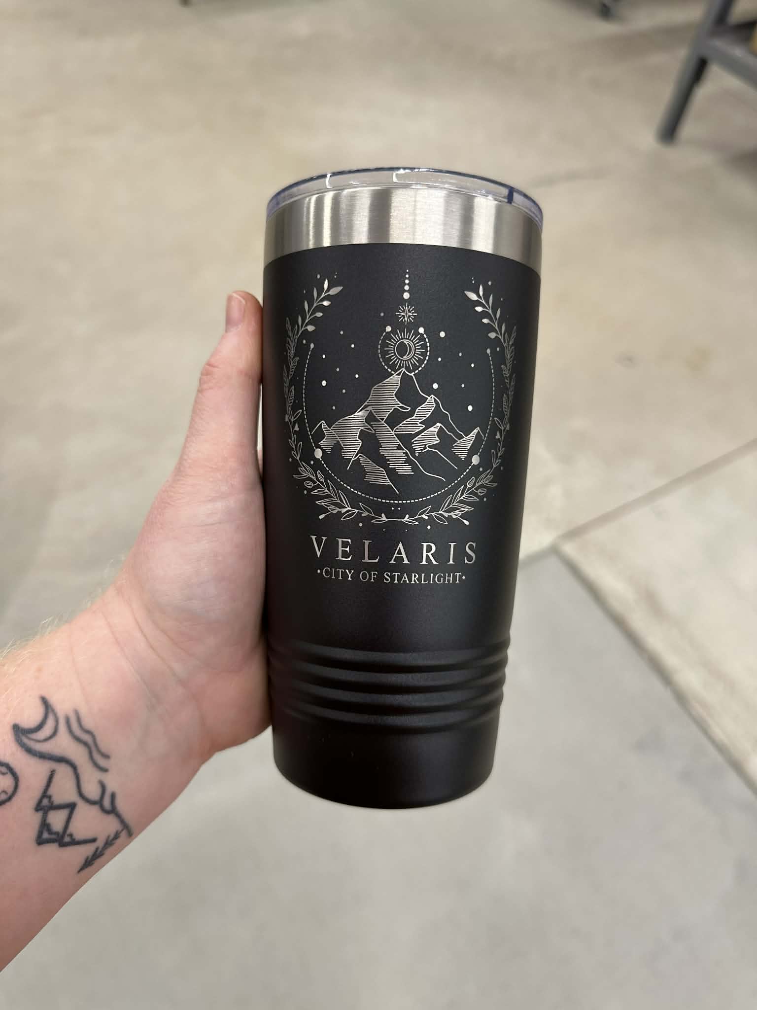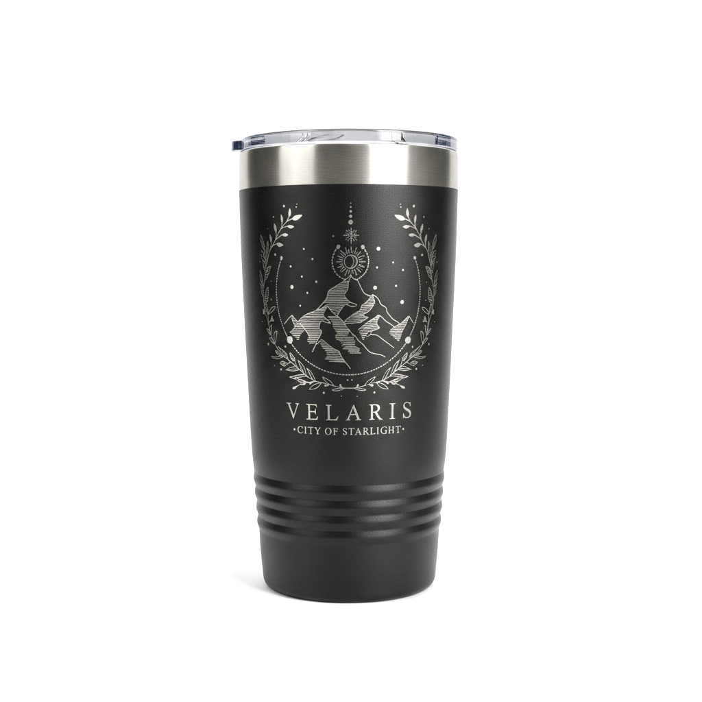 An ACOTAR-inspired tumbler featuring a custom engraving of "Valaris City of Starlight." This polar camel tumbler keeps drinks at the perfect temperature while celebrating your love of Sarah J. Maas's beloved series. Ideal for readers who want their favorite fictional world with them wherever they go.