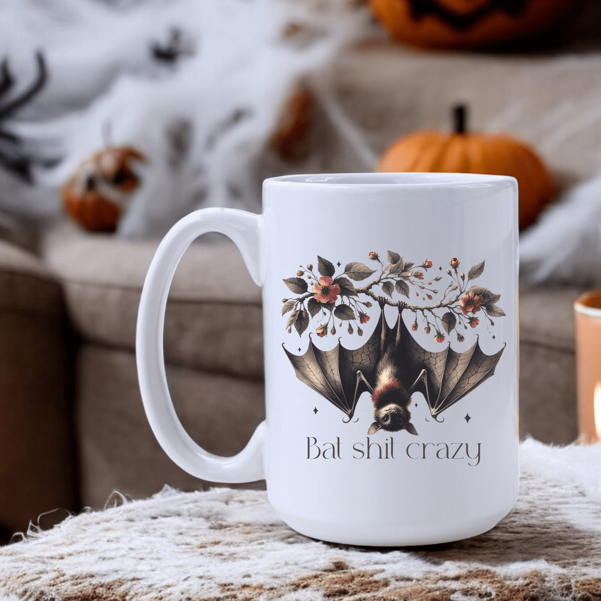 This Bat Shit Crazy mug is perfect for those who don't take themselves too seriously. Featuring a bat hanging from a floral branch, it's truly one-of-a-kind. Embrace your wild side and proudly display this quirky mug. (Bat not included.)