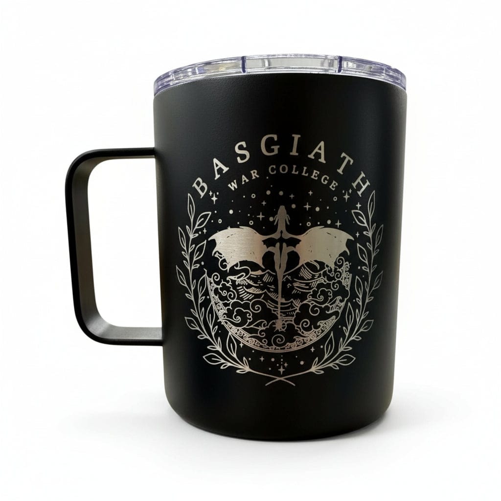 Black 12oz insulated mug with Fourth Wing inspired artwork and secure lid. Double-walled design keeps drinks hot while you read. Perfect for fantasy fans and book lovers who want style with their coffee.