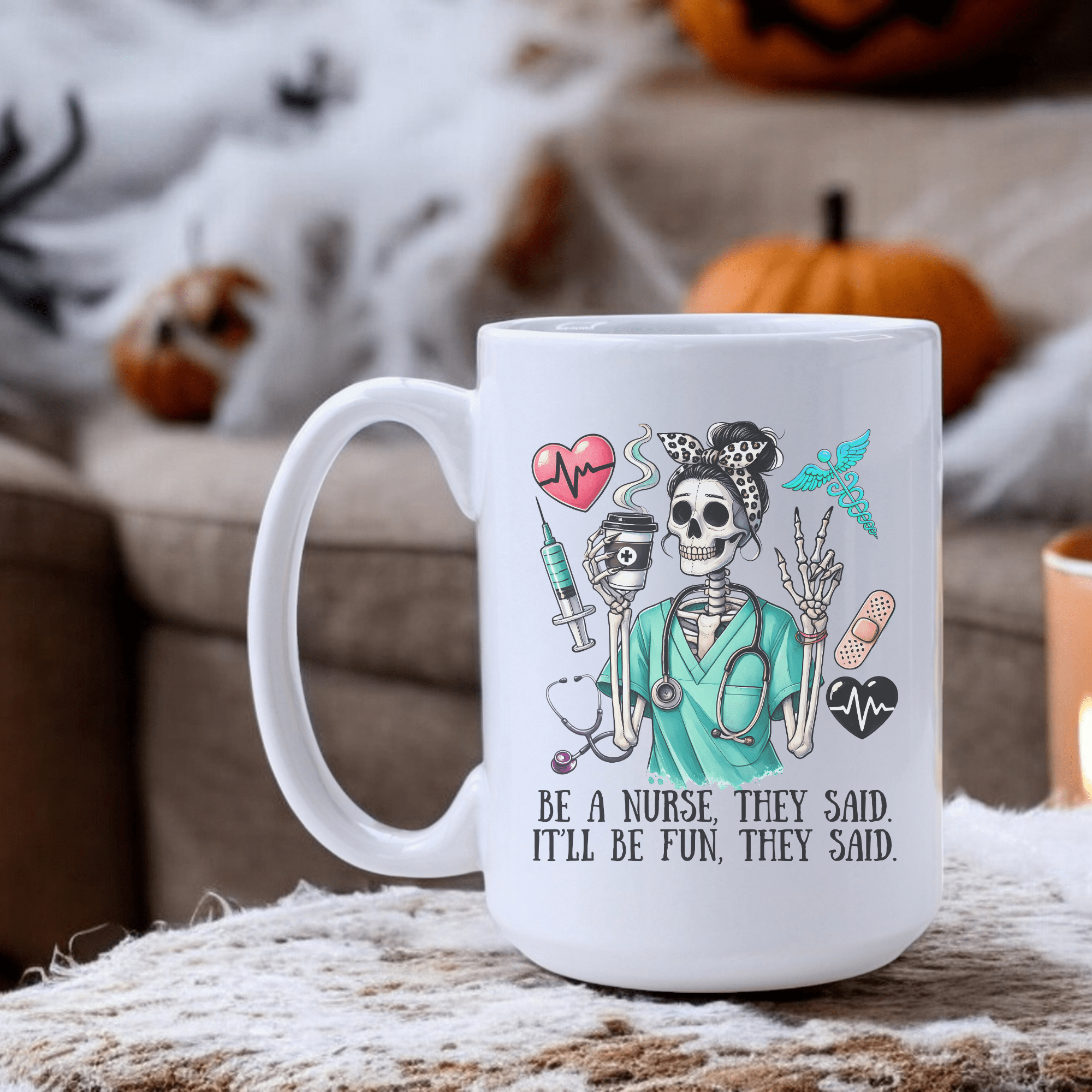 Get ready to sip in style with our "Be a Nurse They Said" mug! Featuring a quirky skeleton design, this mug reminds you to stay positive in the face of challenging situations. Don't worry, it's just another day of saving lives! (Nursing pun intended)