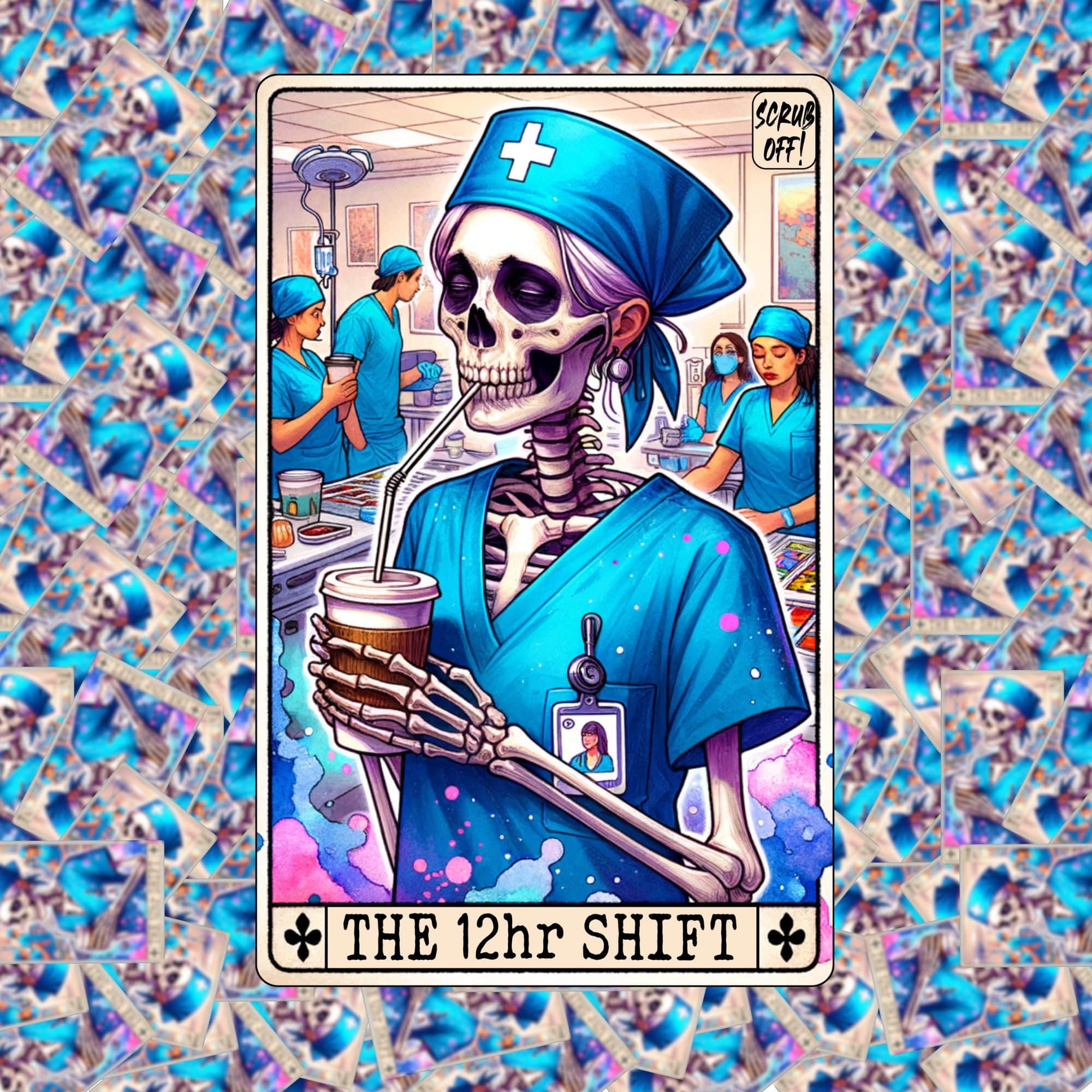 Add some humor to your long shifts with The 12 Hour Shift Nurse Tarot Card Sticker. Featuring a skeleton nurse, this sticker is perfect for those who work long hours and understand the importance of laughter. Make your coworkers laugh with this quirky sticker.