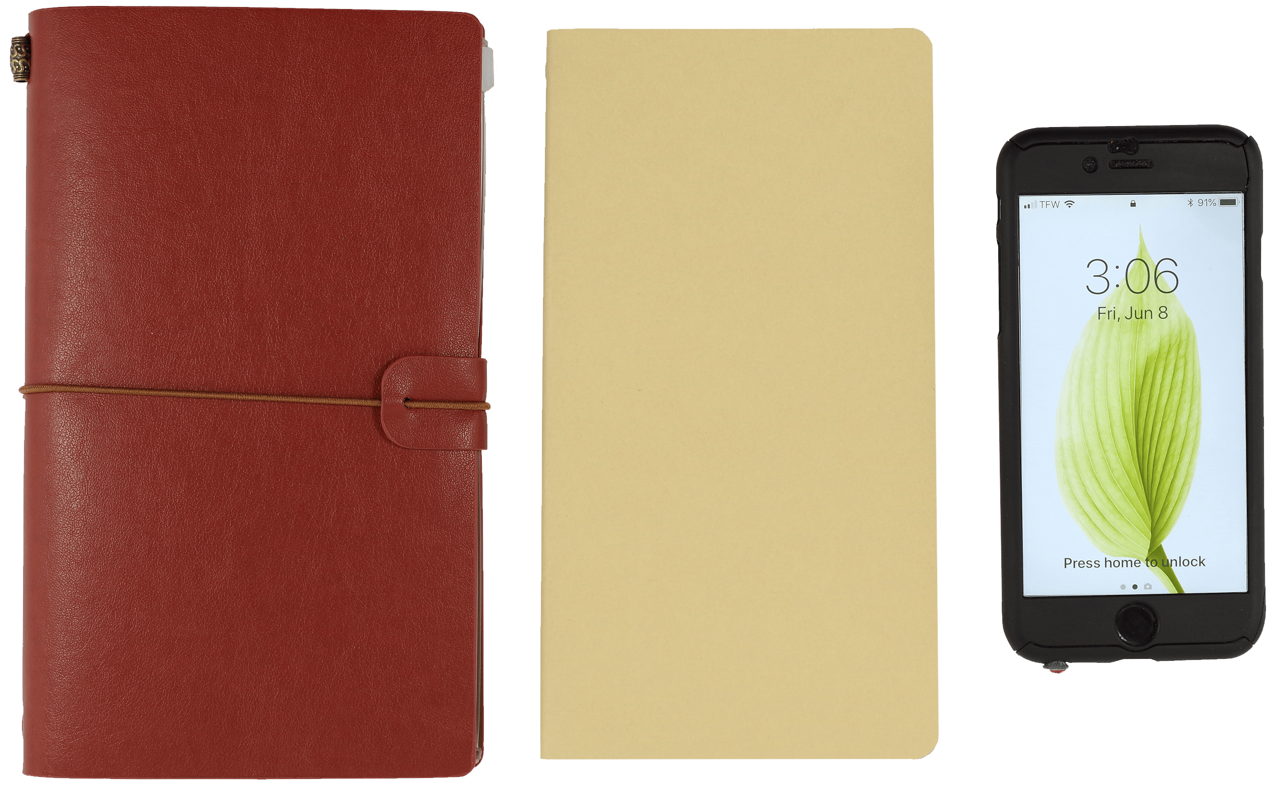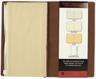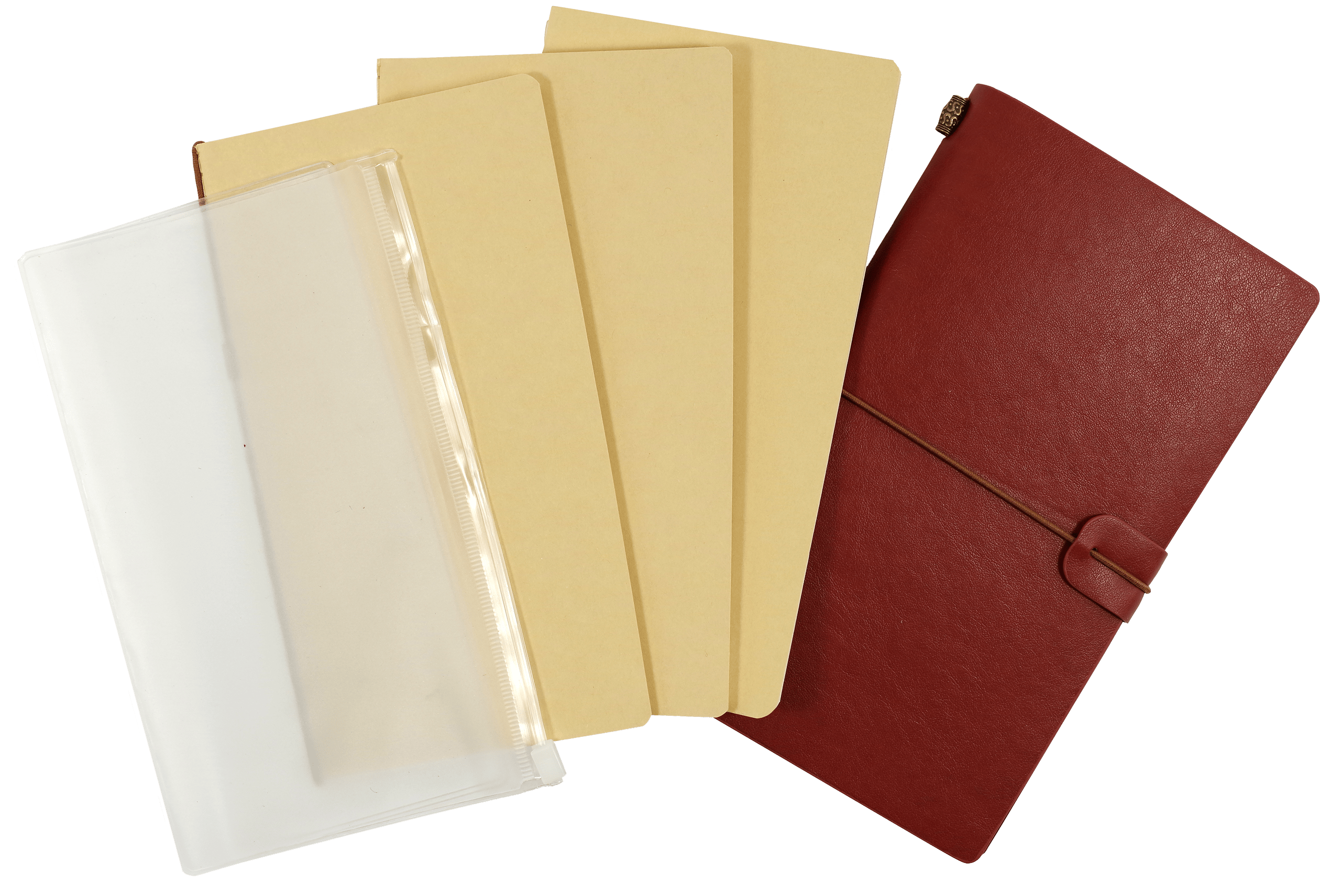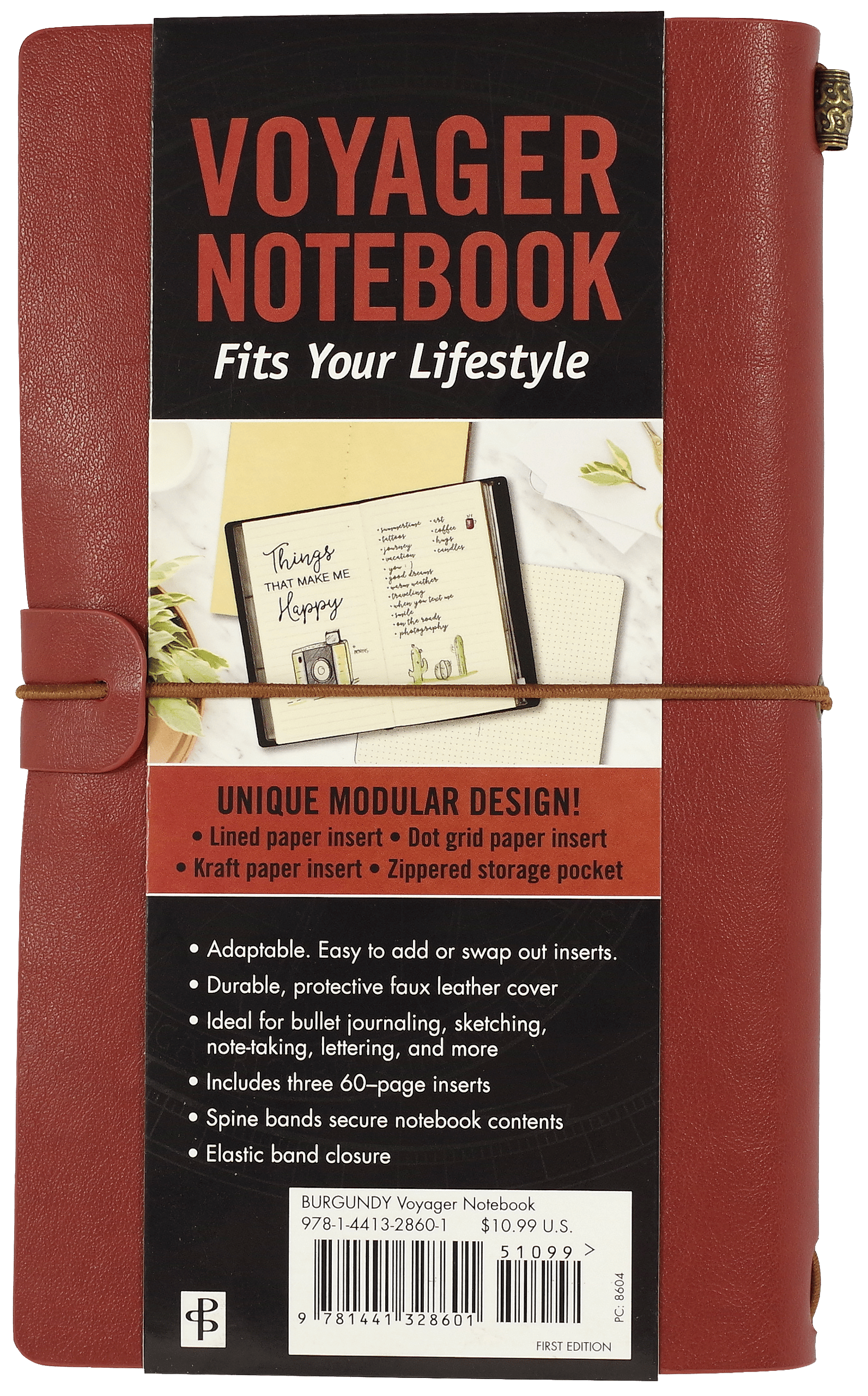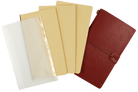 Versatile Voyager Notebook – ideal for journaling, sketching, note-taking, and planning on the go. Features a flexible faux leather cover and three 60-page inserts (lined, dot-grid, and blank kraft paper). Includes a front clear pocket, back zippered pouch, interior stretch bands, elastic closure, and protective flexi-tab. Premium 80 gsm, acid-free, archival-quality paper supports pen or pencil. Finished with a bronze barrel bead accent. Compatible with most modular notebook refills.