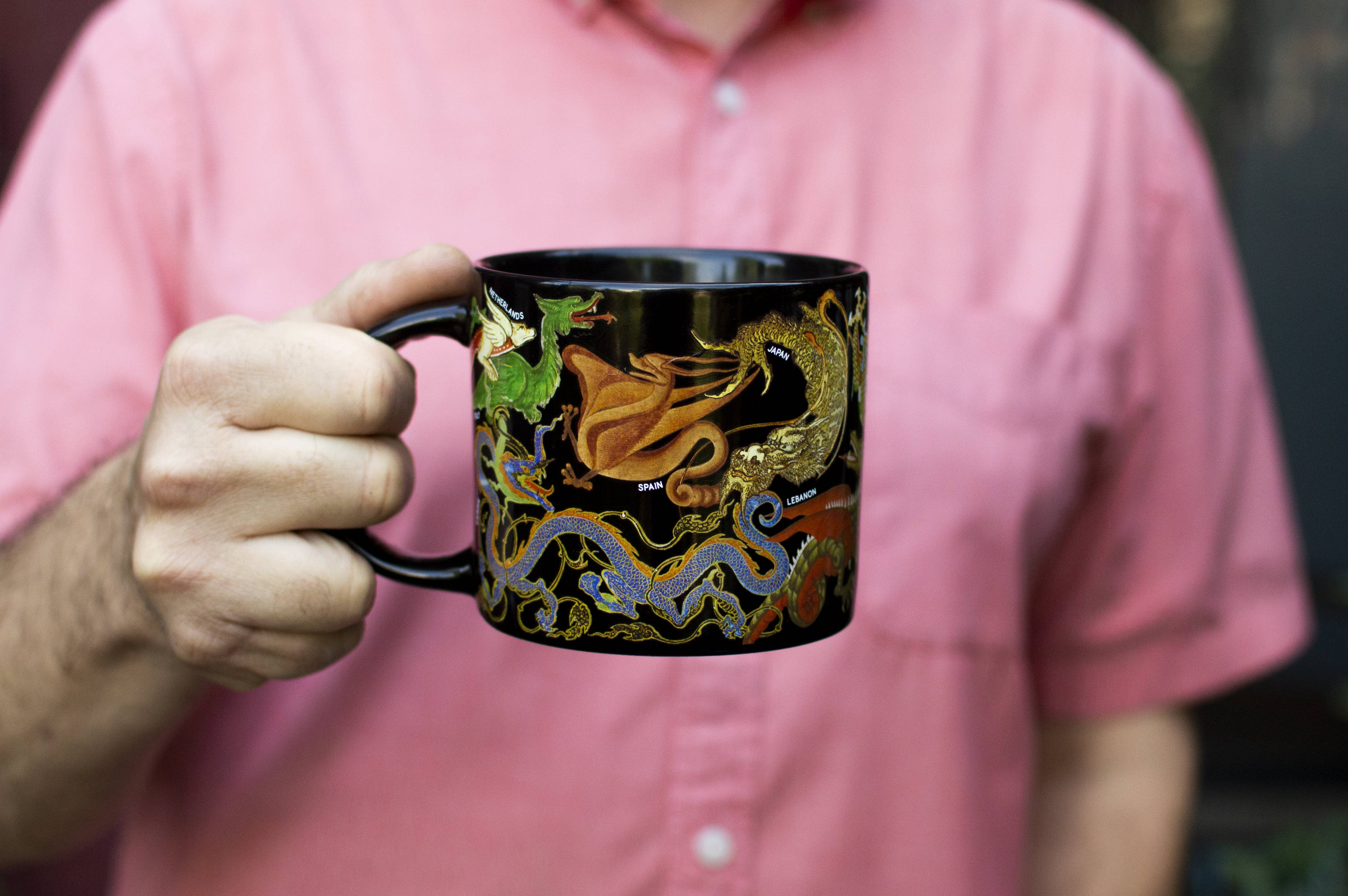Our Dragons mug features 19 dragons from around the world. Perfect for any hot beverage: coffee, tea, hot chocolate, pumpkin spiced beverage.