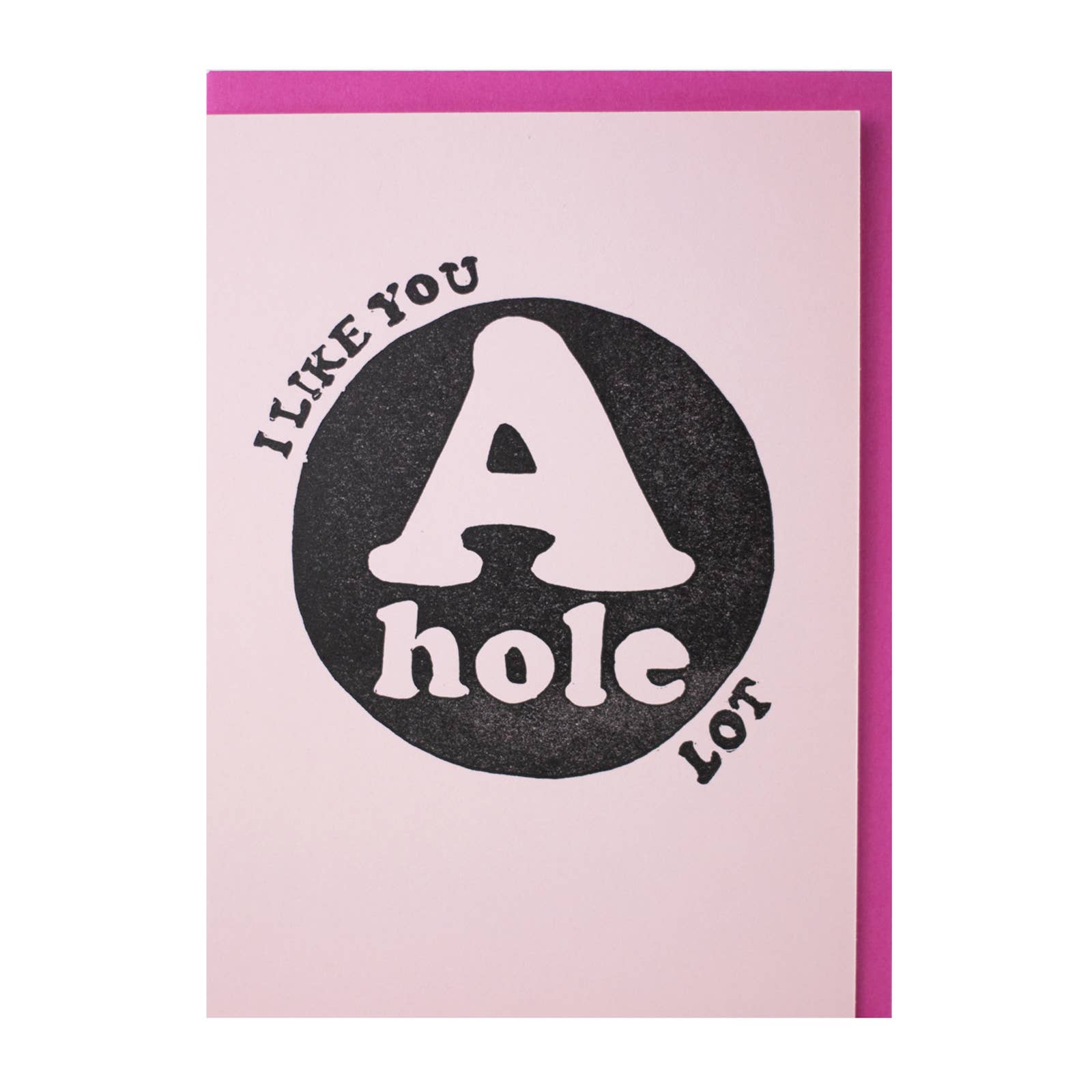 I do use the term A-hole often enough, especially when I am not really feeling that someone is an actual asshole but that they are just sorta an a-hole. I think the fact that A HOLE is the first thing you see but upon closer inspection you see that it is a very sweet card. Each Card handcrafted and Letterpress printed with love in Saint Joseph, Minnesota, USA. •Dimensions 6.3" l x 4.5" w •Letterpress printed on a 1950 Chandler & Price press •All text is hand-set metal and wood type •Images are collected vintage copper plates or hand-carved linoleum blocks •Cards are A6 with coordinating envelope and sleeve •Cards with text on the inside come with a sticker on the front. This is an A6 card with matching pink envelop