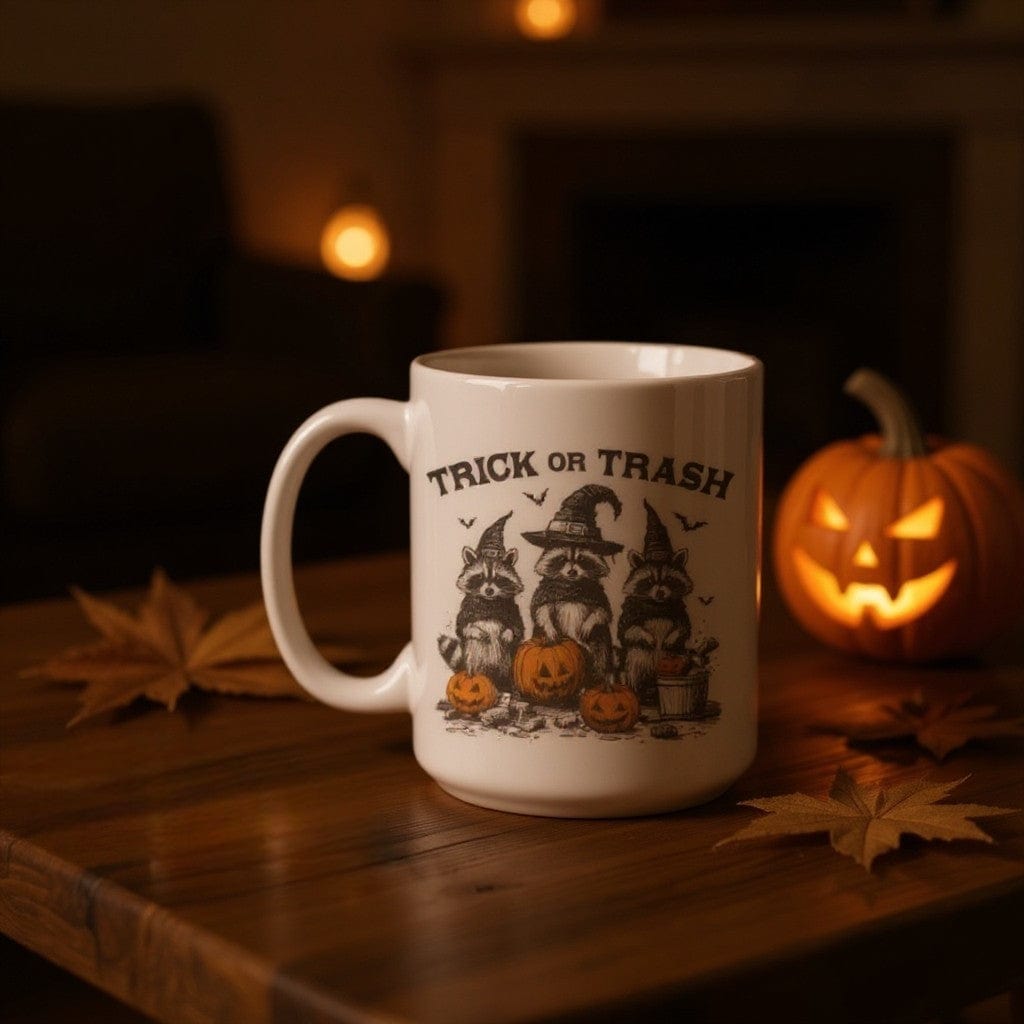 Give your Halloween mug some personality with the Trick or Trash Racoons design! These mischievous little critters are all dressed up in witch hats, adding a playful touch to your morning coffee or tea. A perfect addition to your spooky season decor.