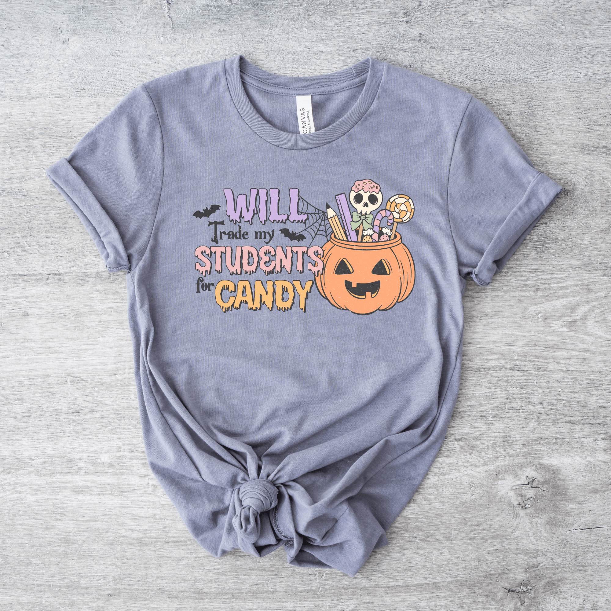 Be the envy of your teacher friends with this ironic t-shirt that will make sure everyone knows what's at the top of your Halloween wishlist: candy! Show off your spooky sense of humor and make sure everyone knows - you'll trade your students for candy! Trick or treat for a treat! 🧛♀️