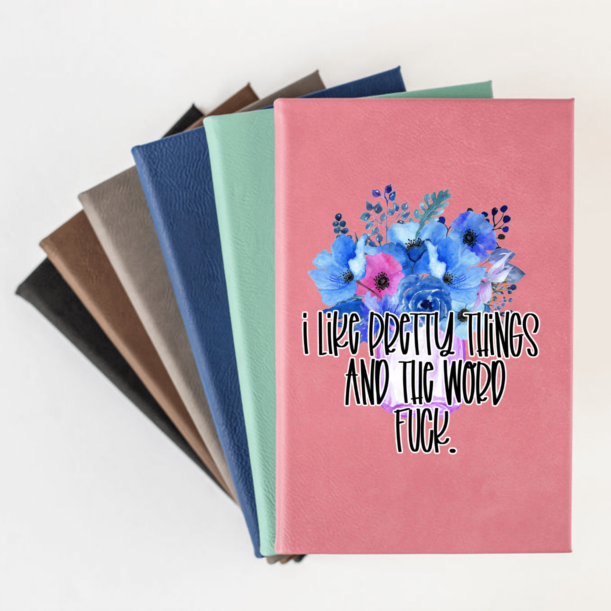 This beautiful leatherette journal printed with the design, I Like Pretty Things and the Word Fuck.