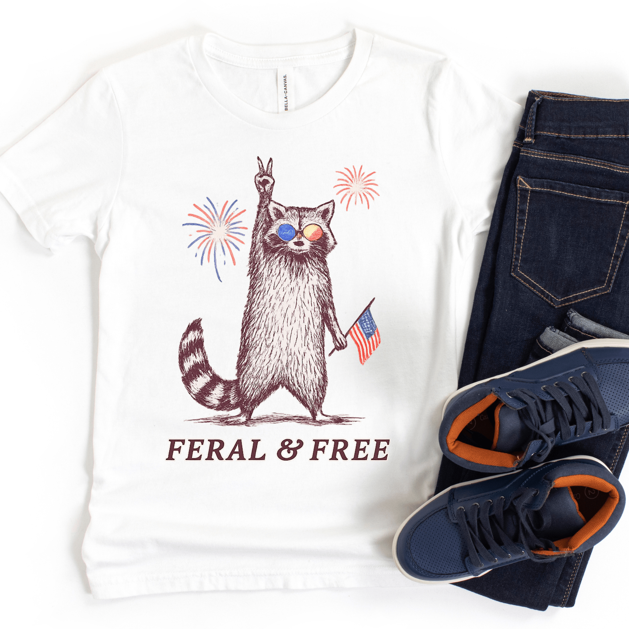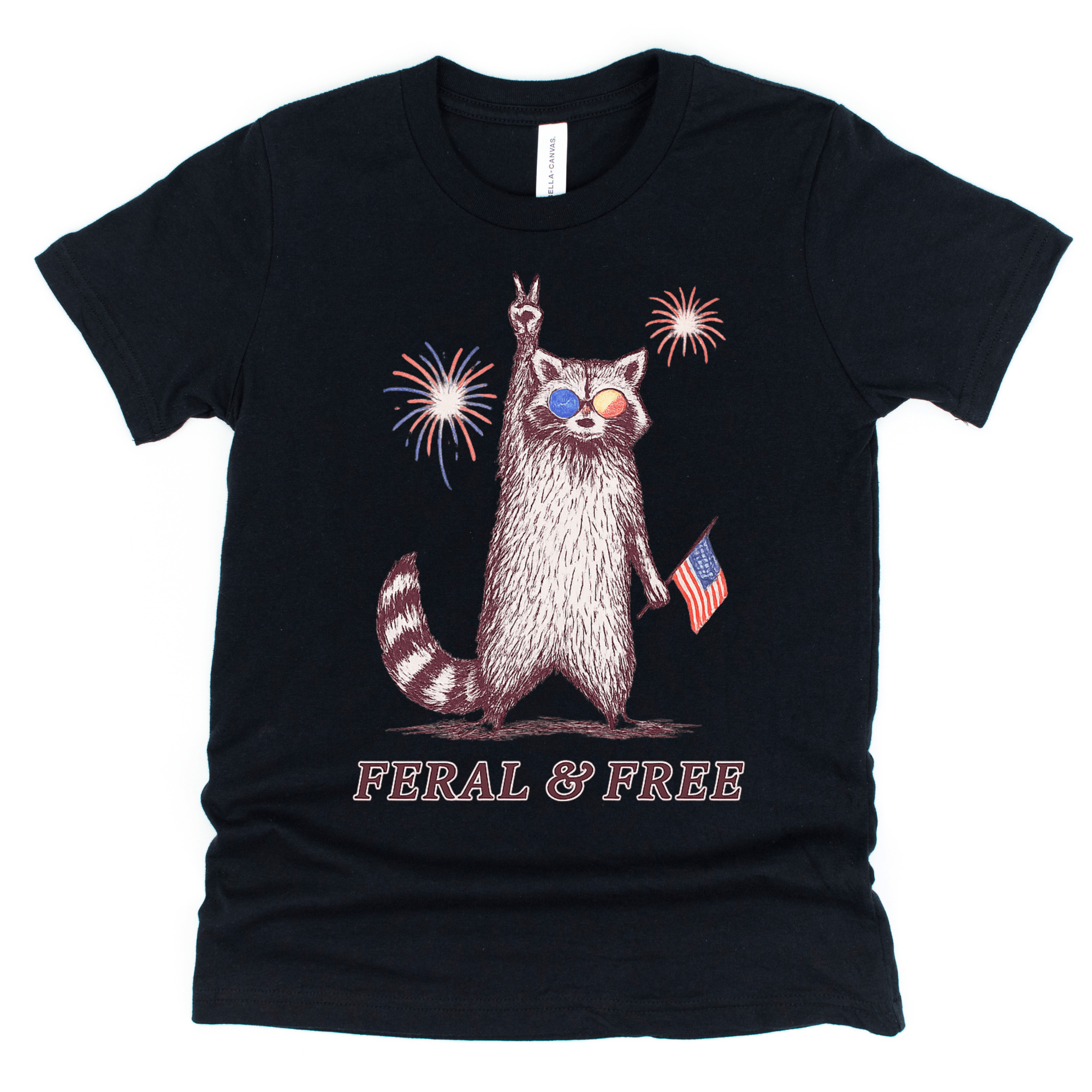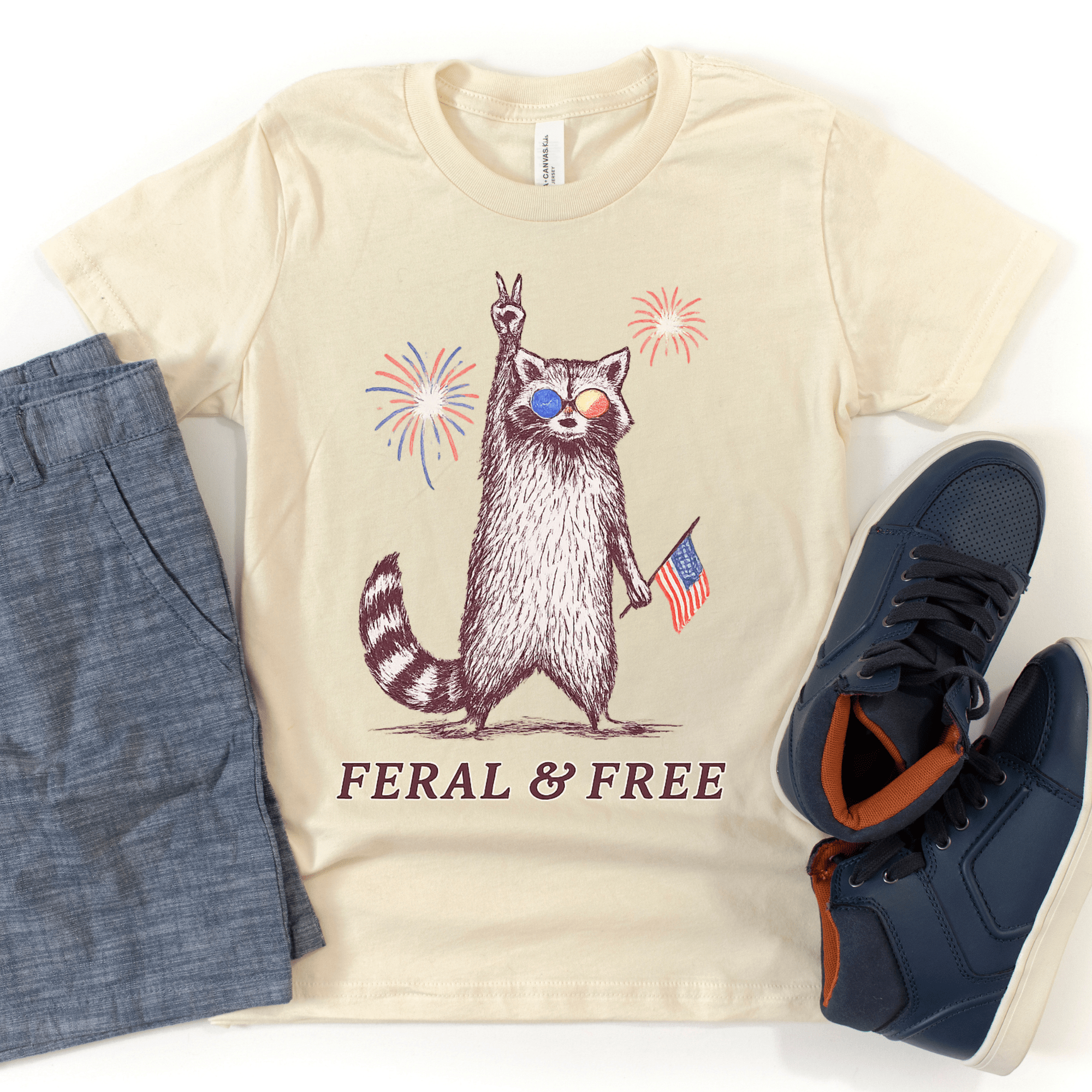 Celebrate Independence Day with the Feral & Free Kids July 4th T-Shirt! Featuring a playful raccoon sporting American flag aviators, flashing a peace sign, and holding a vibrant flag against a backdrop of fireworks, this tee brings fun and festive spirit to your child's wardrobe. Perfect for July 4th festivities, it combines comfort and patriotic style for a memorable holiday look.