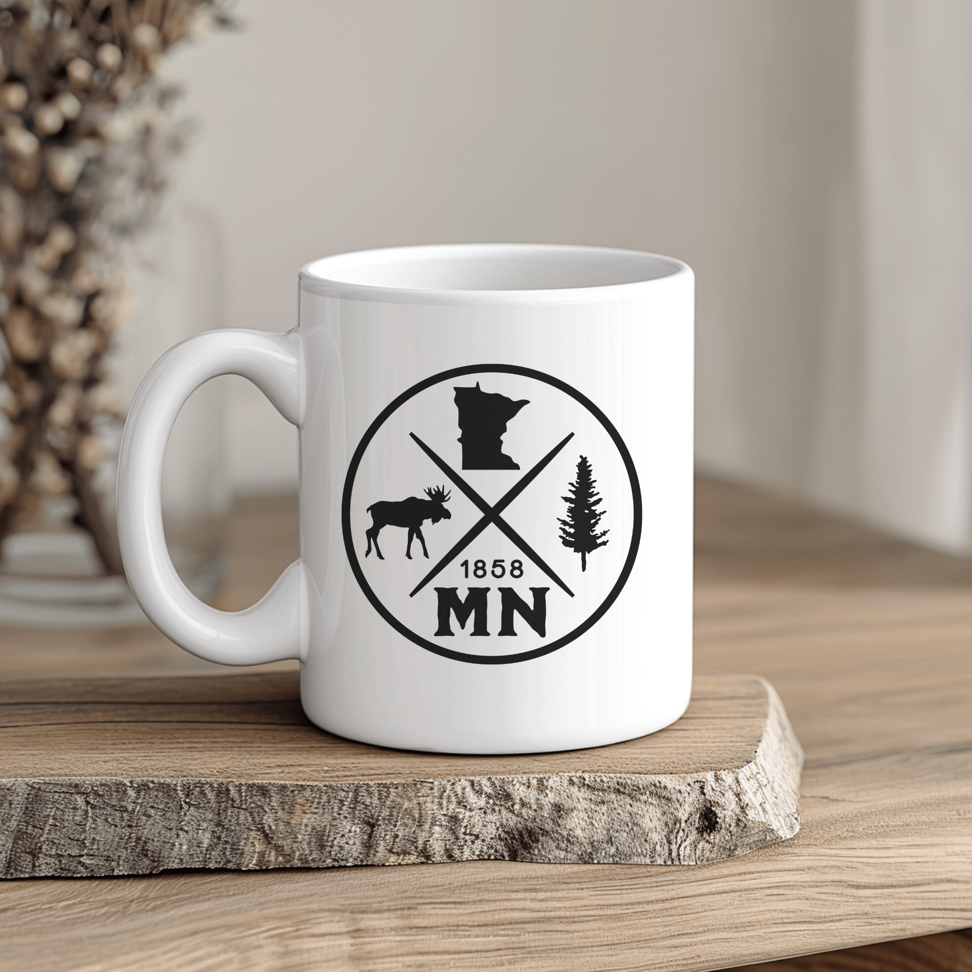 Experience the charm of Minnesota with our Circle Moose Mug. The perfect addition to your collection, this mug features a moose, pine tree, and Minnesota state outline all inside of a circle design.