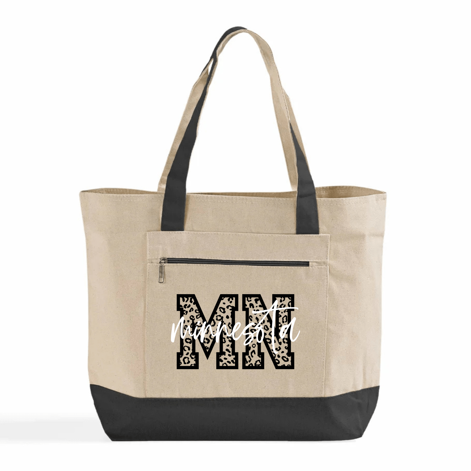 Show off your bold style and Minnesota pride with the Minnesota MN Canvas Tote. Featuring a striking leopard print design with "Minnesota" elegantly written above the state abbreviation, this tote combines trendy fashion with local love. Perfectly sized for everyday use, it offers both durability and eye-catching appeal—making it an essential accessory for anyone who wants to stand out while celebrating their home state.